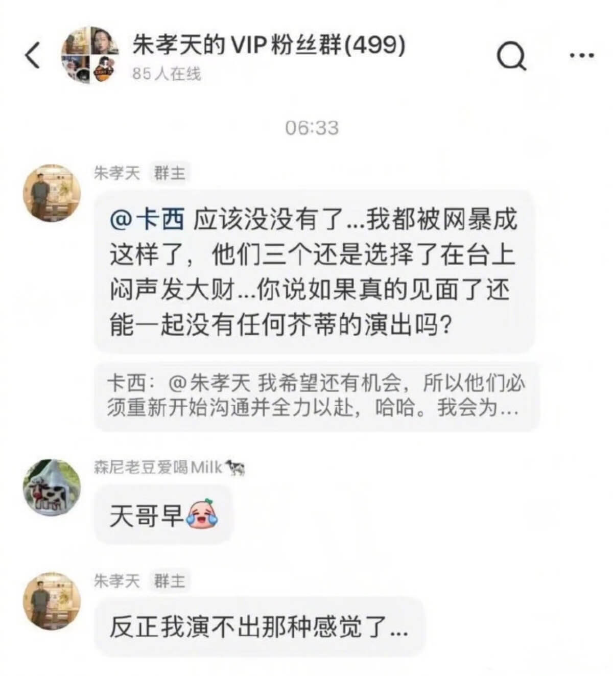 隨後,他在粉絲群表示自己被網暴成這樣,F3還選擇了在台上悶聲發大財,自己應該不會再和他們毫無芥蒂的演出了,表示「反正我演不出那種感覺了…」