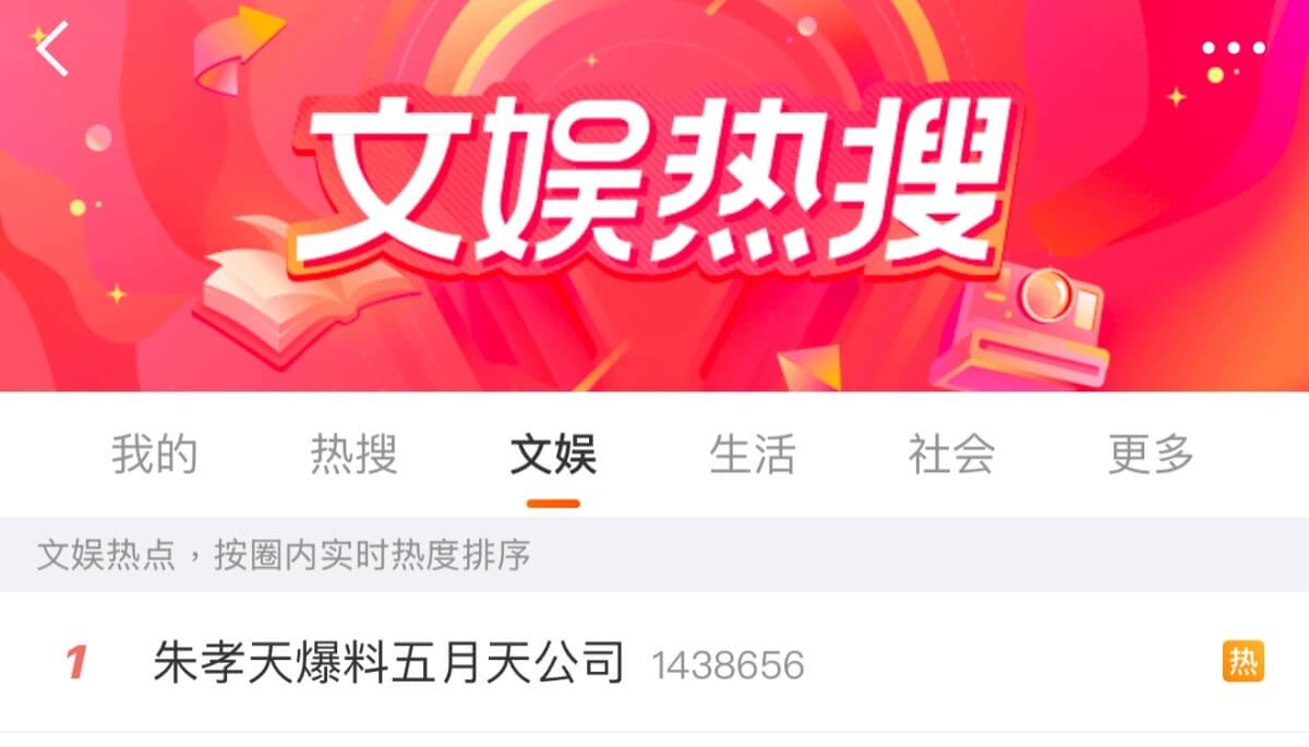 目前已經是熱搜第一話題,不過有關「朱孝天明涵阿信」,以及「朱孝天爆料五月天公司」的熱搜詞條,已經搜尋不到任何內容。