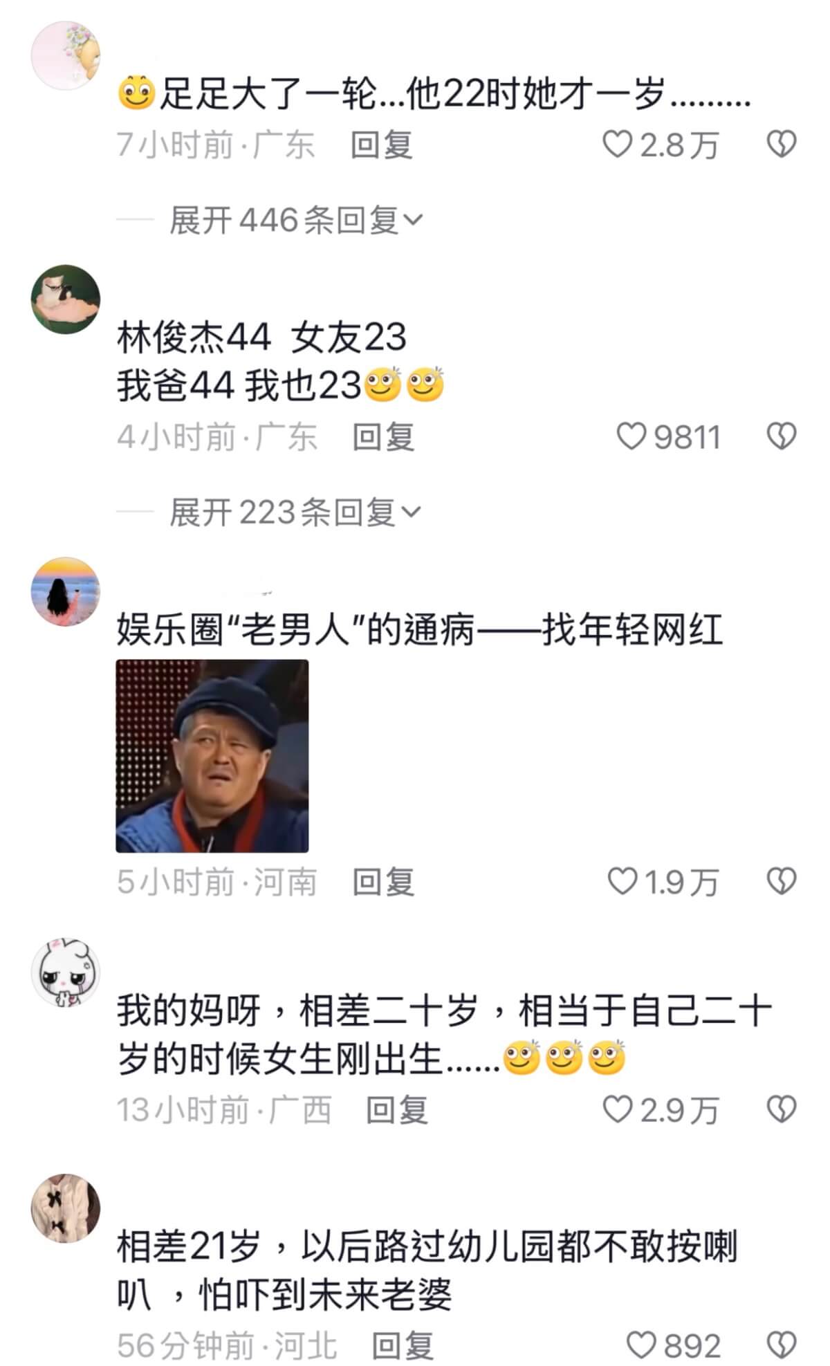 而在抖音的評論區,針對兩人的年齡差,也有不少網友給予了意見👇
