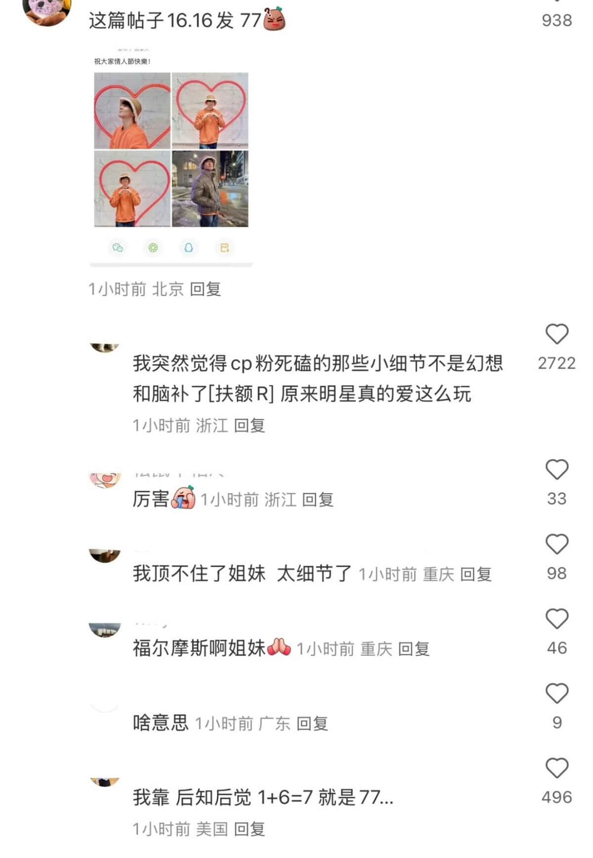 注意到了嗎?發帖時間是16:16分,網友神解讀:「1+6=7」,所以16:16等於「七七」,也就是其女友名字~