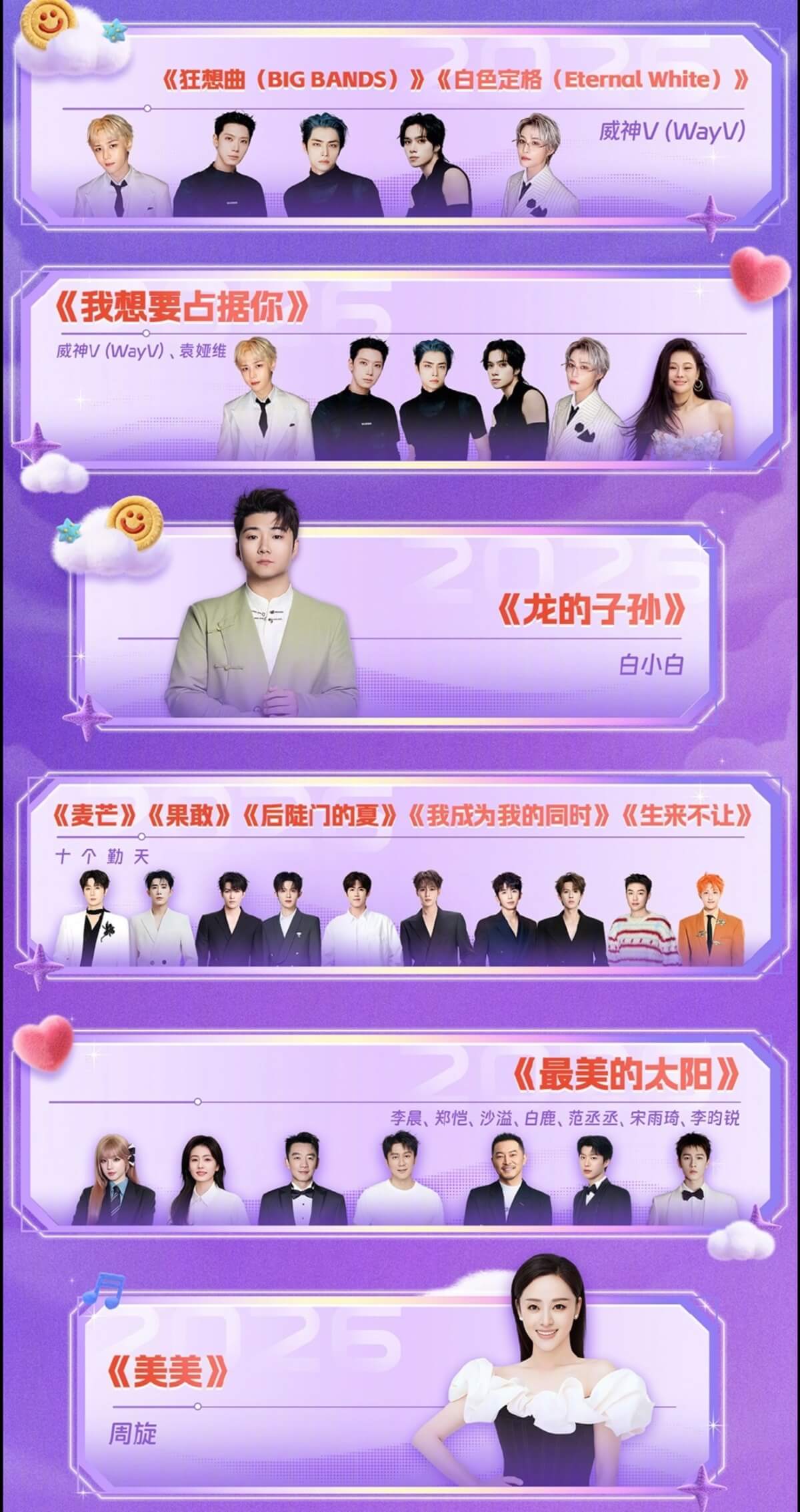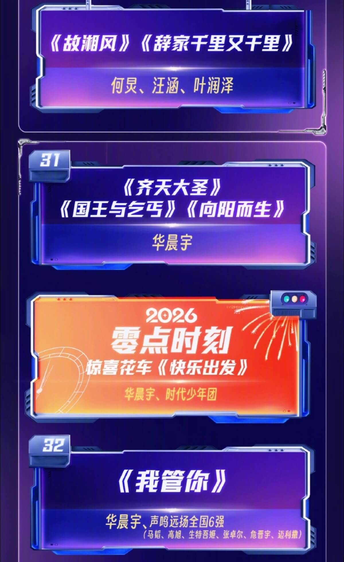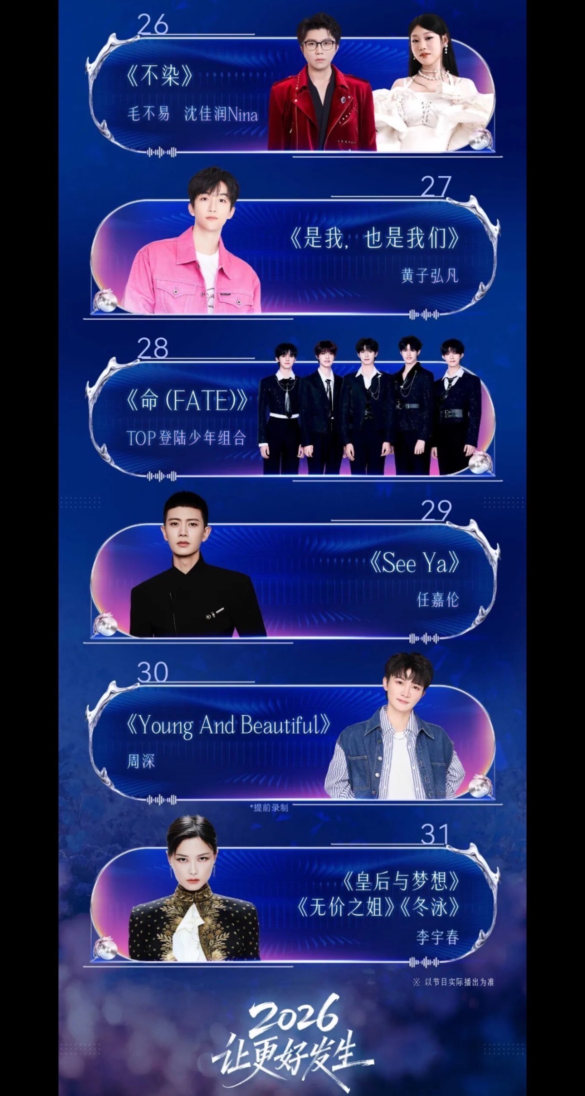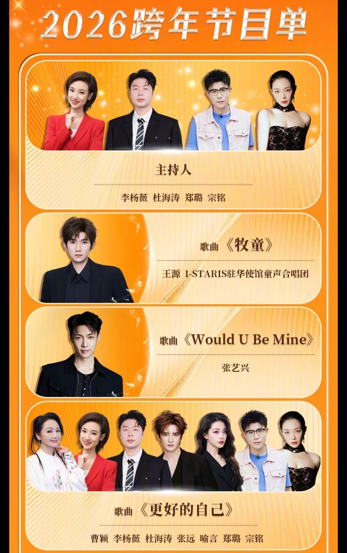 來啦!五大衛視跨年晚會最齊節目表!上百藝人陪你倒數迎接2026! 綜藝星聞 By 歐巴是我的 Last updated Dec 31, 2025 Share 是達,每年最後一天最受關注的,自然就是跨年晚會啦!到底今年的跨年有什麼節目?這就來看看中國五大台的跨年節目表,每一場都很精彩啊! 東方衛視「閃耀City」上海主會場 北京衛視雙會場(大鐘寺+居庸關) 江蘇衛視「更好2026」澳門主會場 浙江衛視「6得飛起」衢州主會場 湖南衛視「熾熱出發」海口主會場 你最想看哪一場呢? 圖來源:部分照片取自網路,若侵權請告知 Share
