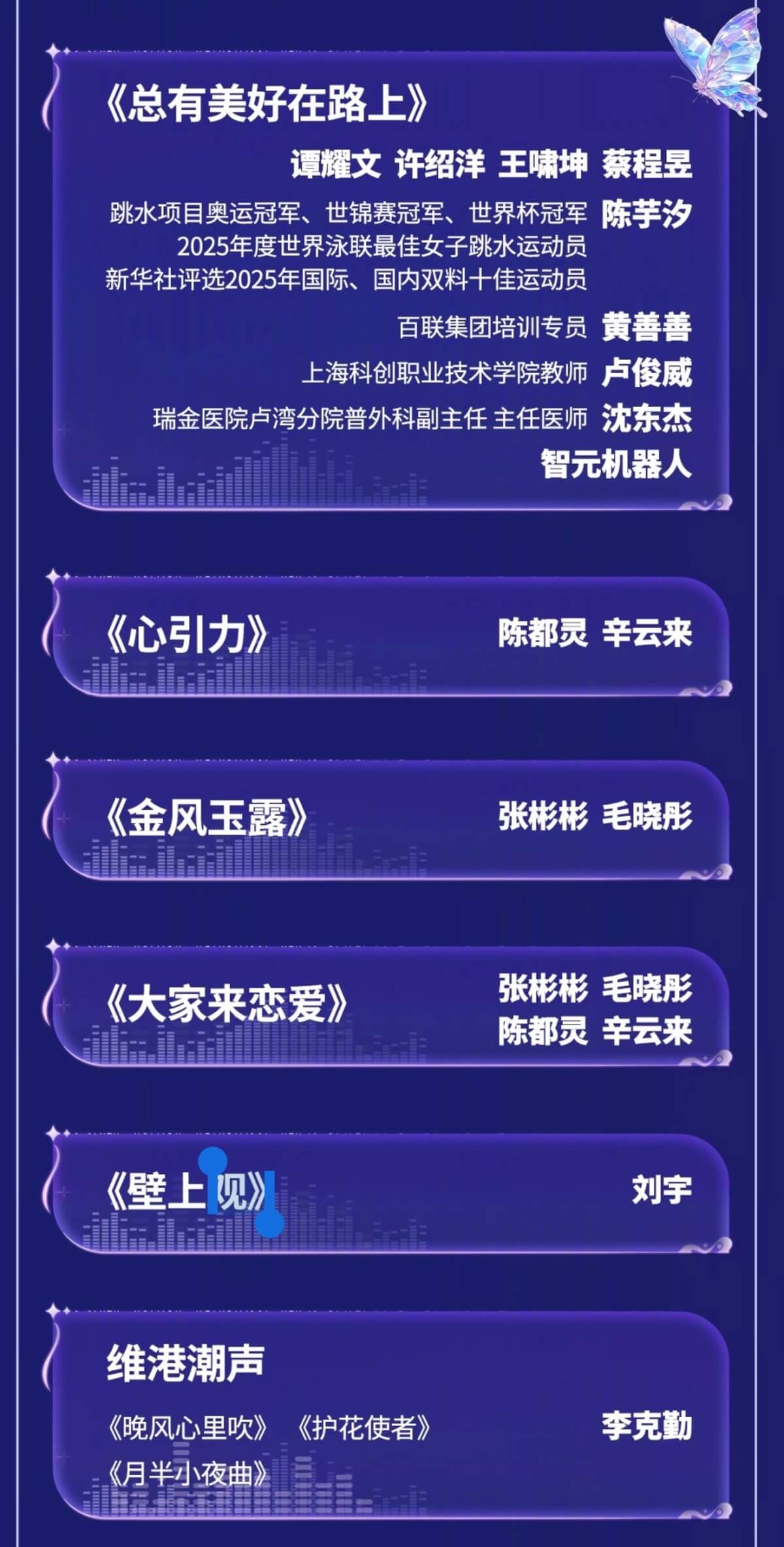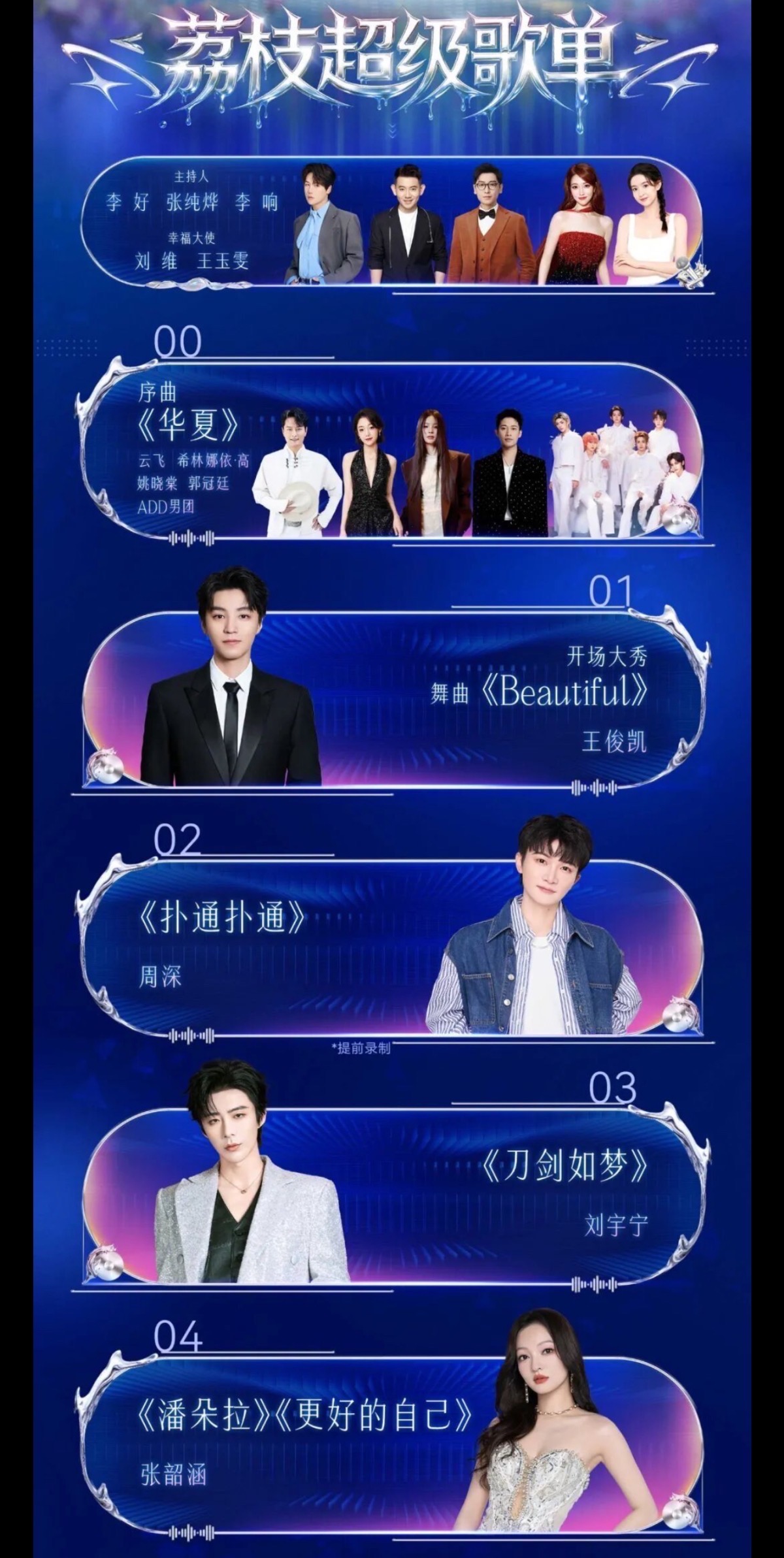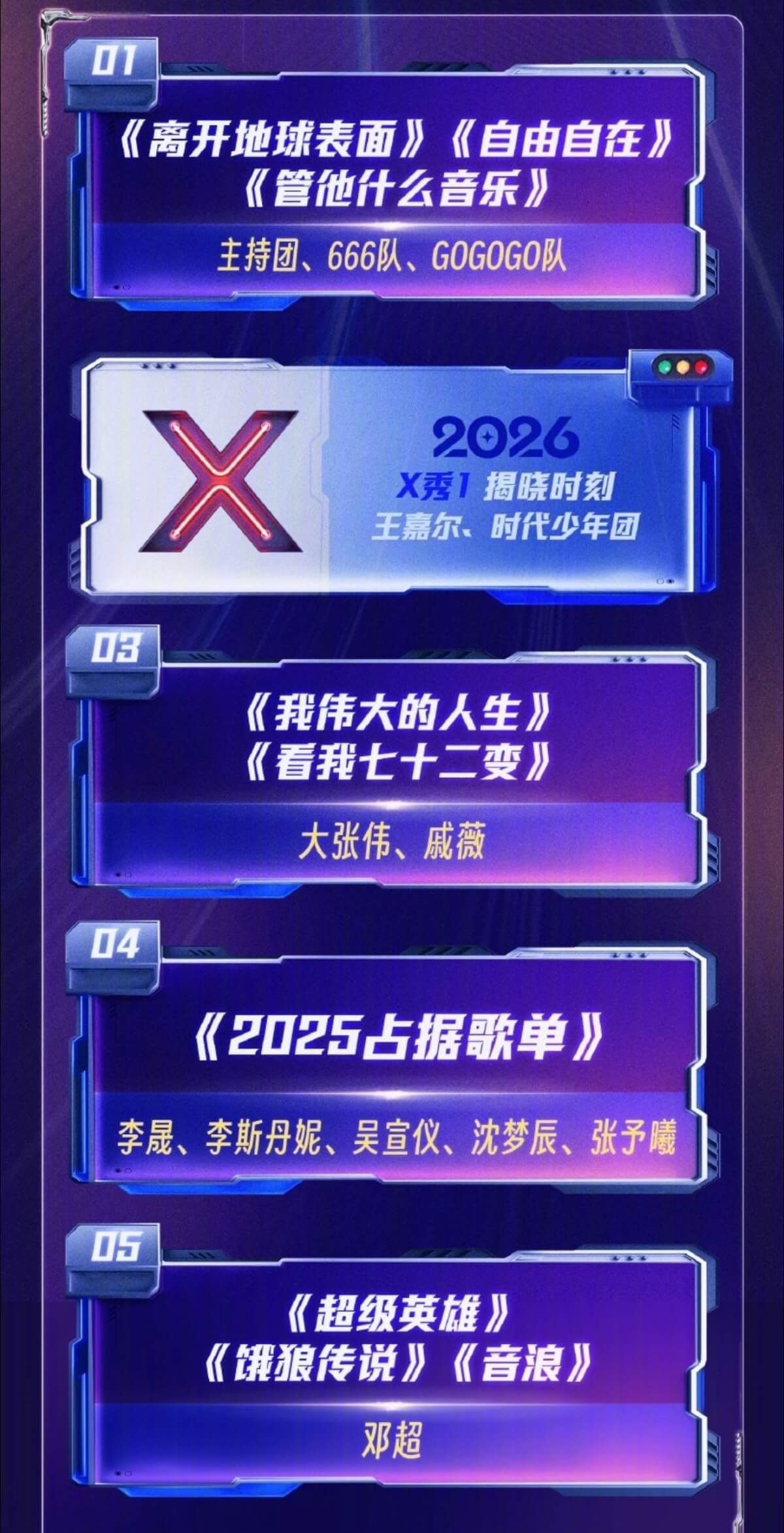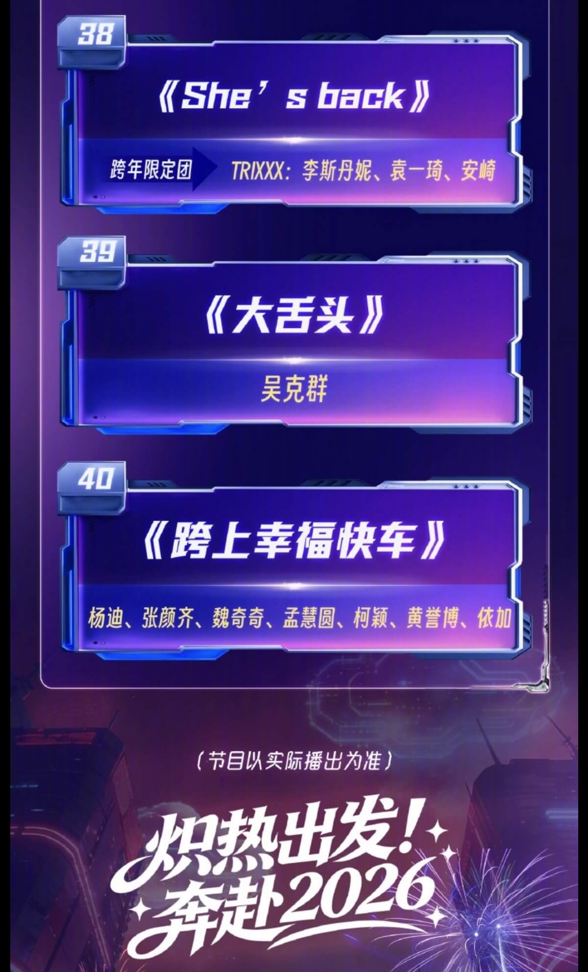 來啦!五大衛視跨年晚會最齊節目表!上百藝人陪你倒數迎接2026! 綜藝星聞 By 歐巴是我的 Last updated Dec 31, 2025 Share 是達,每年最後一天最受關注的,自然就是跨年晚會啦!到底今年的跨年有什麼節目?這就來看看中國五大台的跨年節目表,每一場都很精彩啊! 東方衛視「閃耀City」上海主會場 北京衛視雙會場(大鐘寺+居庸關) 江蘇衛視「更好2026」澳門主會場 浙江衛視「6得飛起」衢州主會場 湖南衛視「熾熱出發」海口主會場 你最想看哪一場呢? 圖來源:部分照片取自網路,若侵權請告知 Share