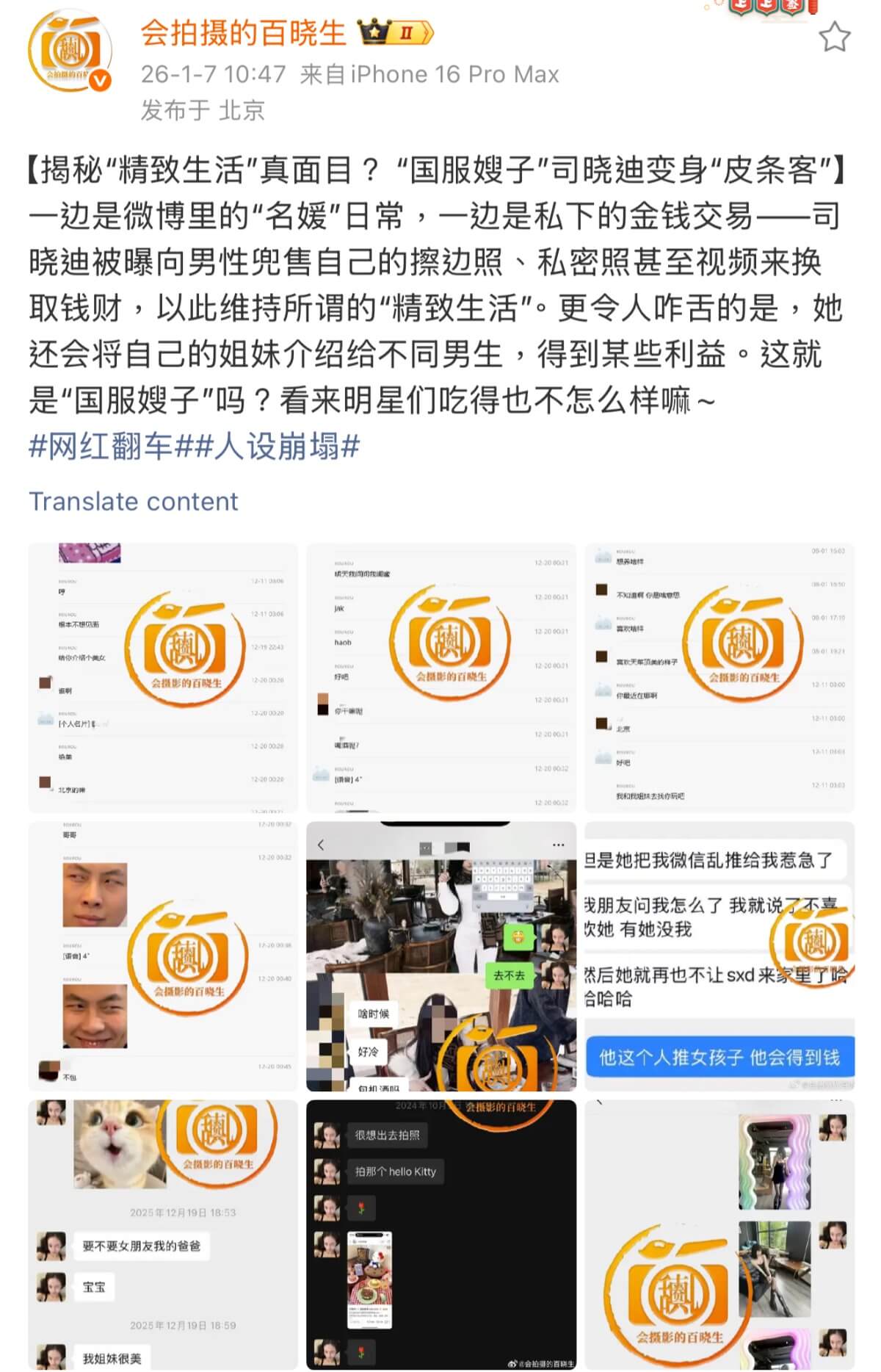 沒想到隔天狗仔就再次爆料,這次公開指控司曉迪是皮條客,將自己身邊的閨蜜介紹給其他人,還有兜售自己的擦邊照以換取錢財~