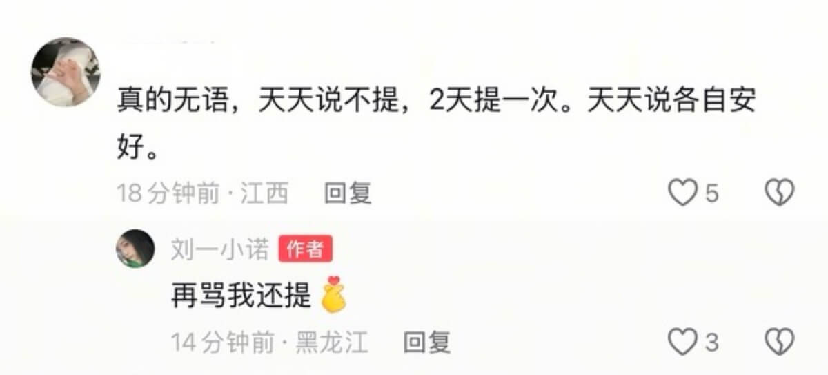 有網友對劉一諾,一直靠提檀健次博熱度,劉一諾直接回應:「再罵我還提。」