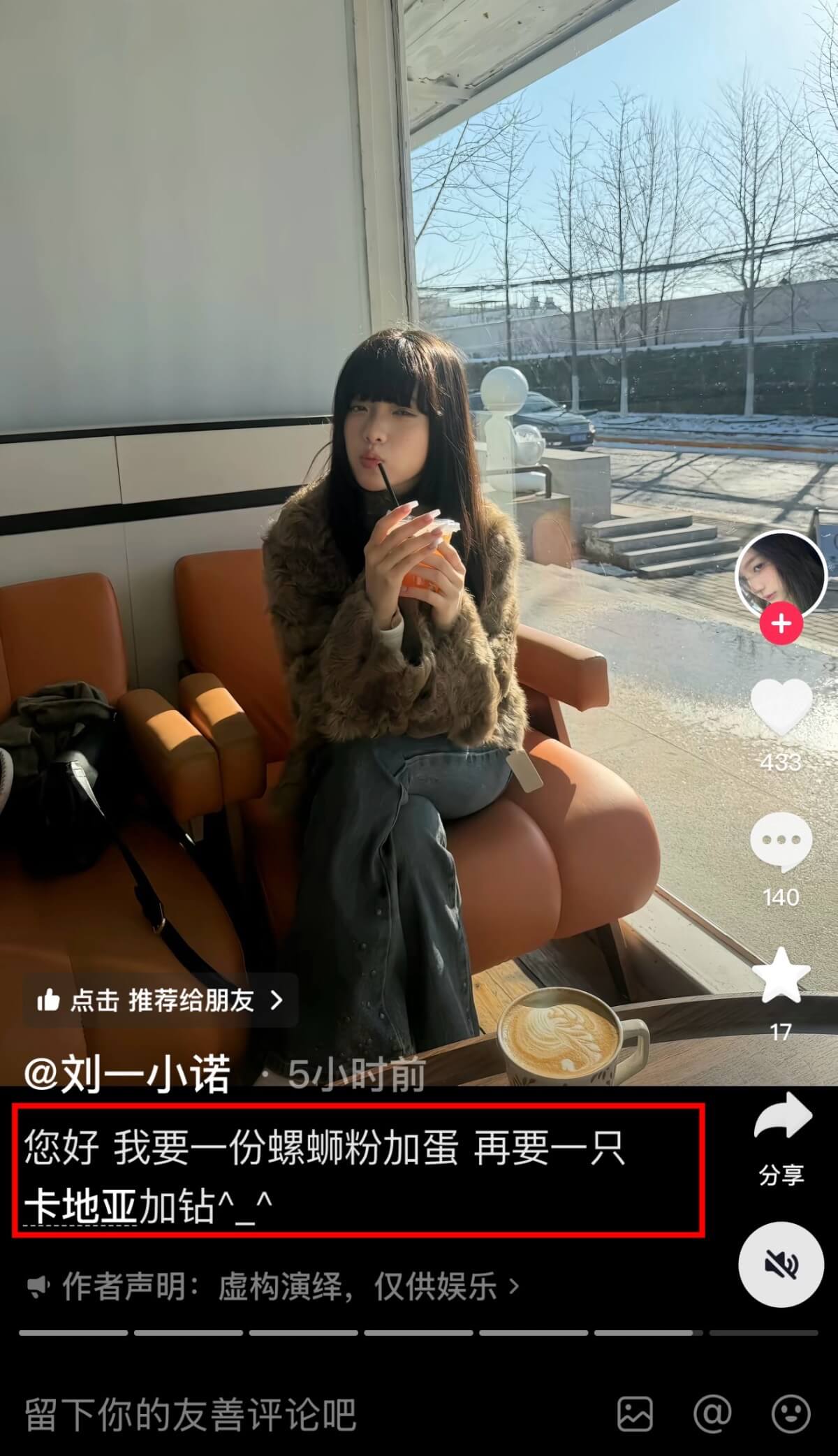 到底怎麼一回事呢?來看看劉一諾這則帖文的文案:「您好,我要一份螺螄粉加蛋,再要一隻卡地亞加鑽。」
