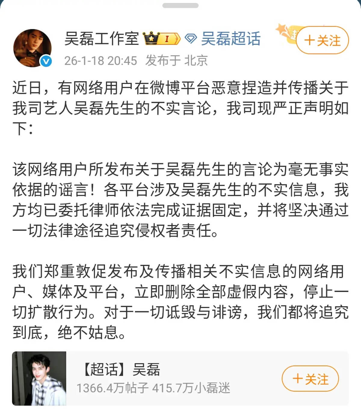 隨著熱議,吳磊工作室火速發聲明嚴正聲明,並表示取證提告👇