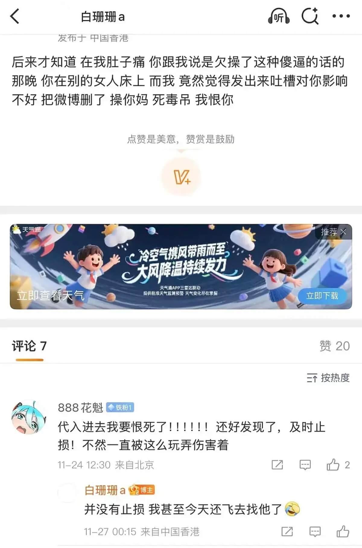 這條微博引來網友深扒,發現在去年11月24號,她就曾發文疑似狂罵另一半👇