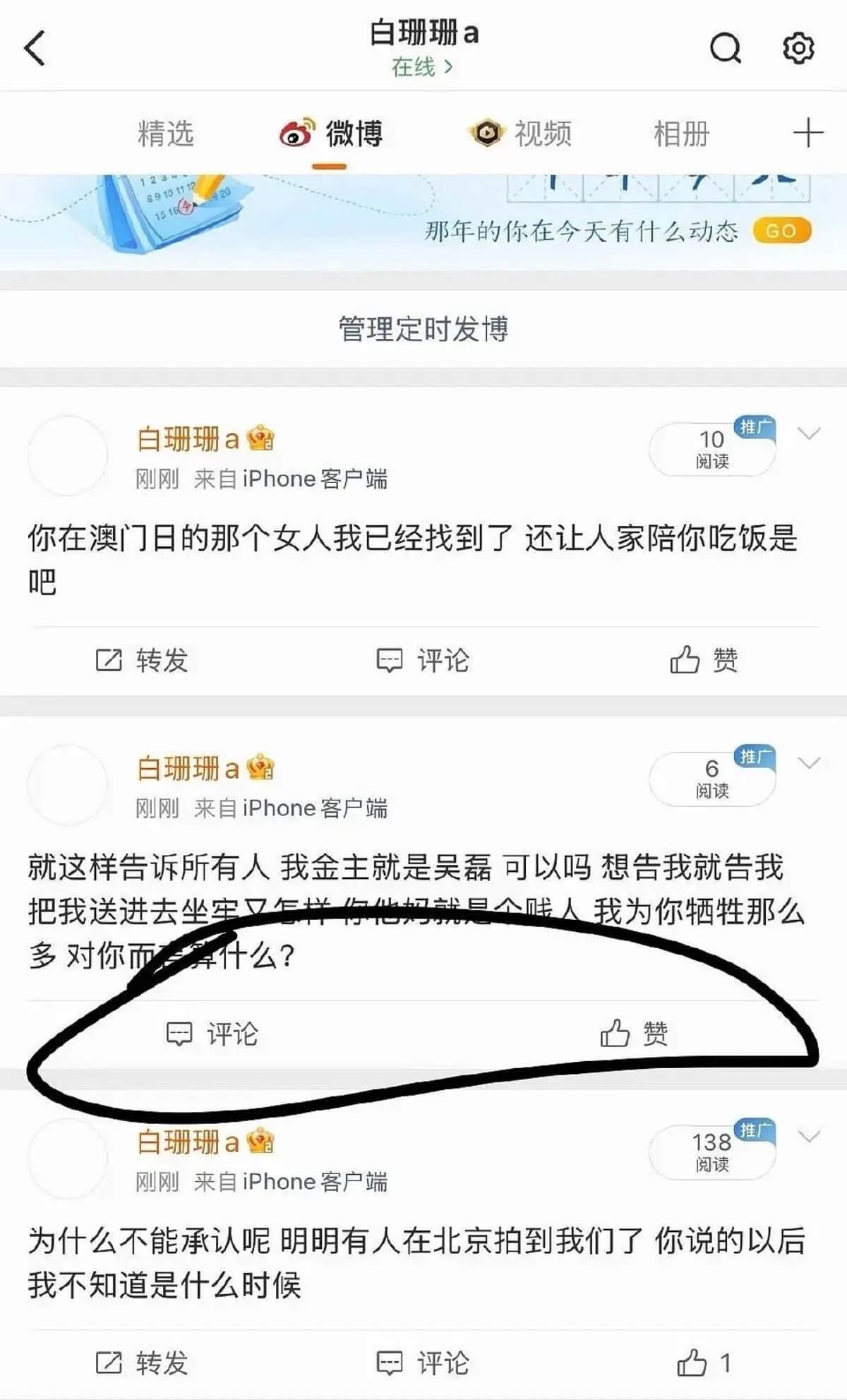 這位網友繼續在微博狂發吐槽,當中就提到了自己的金主就是吳磊,但這些微博很快就被刪除👇