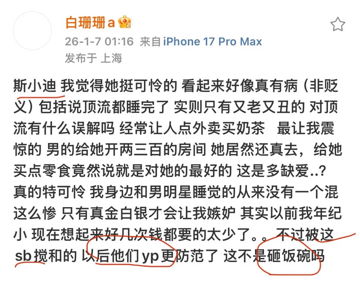 網友繼續扒出她曾評價前不久爆料多位男藝人約炮的司曉迪,表示她這麼做是自砸飯碗,以後男明星約炮更防范了👇