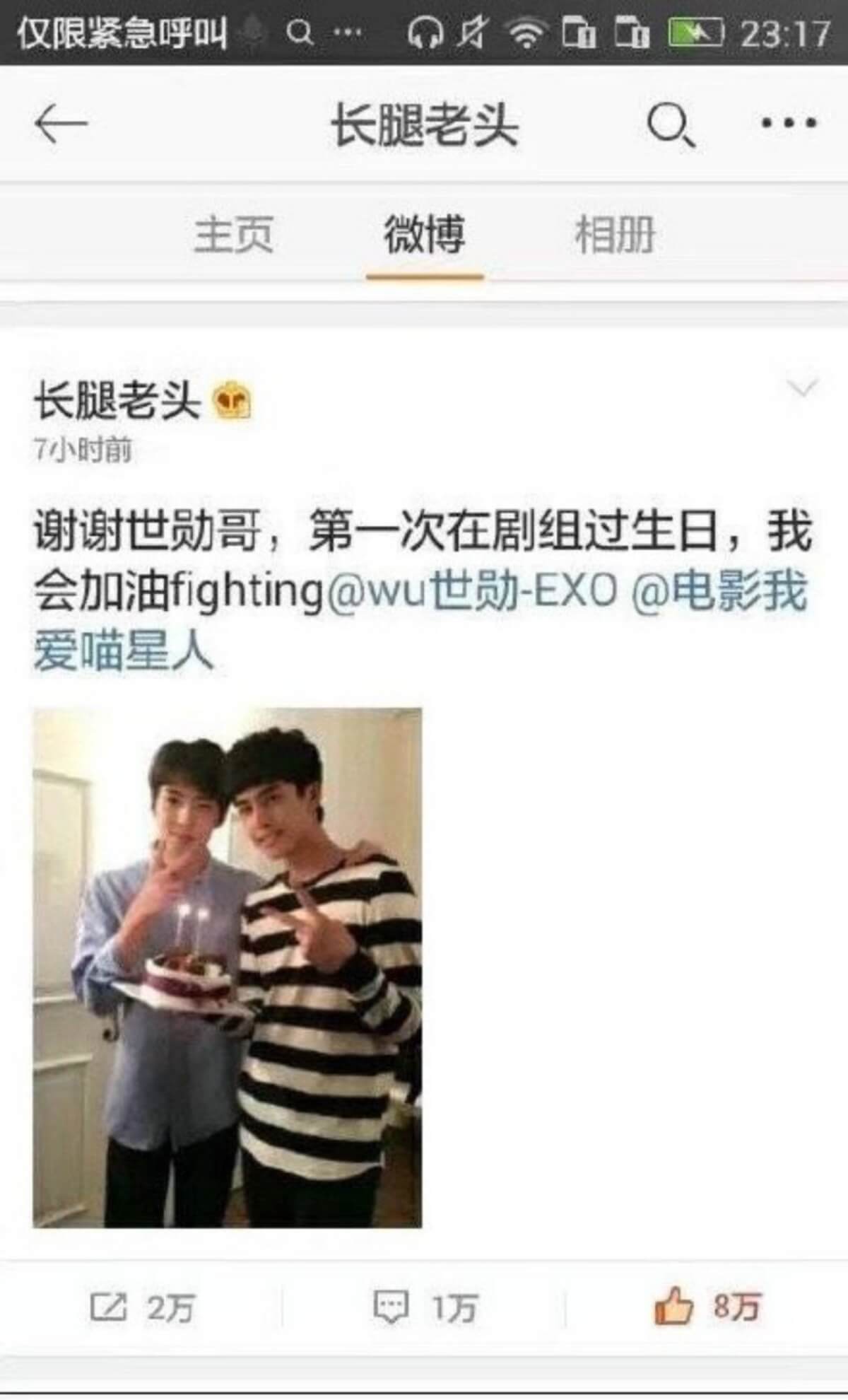 當時在拍攝電影時,就適逢宋威龍17歲生日,他也發文曬出了和Sehun的合照,謝謝對方幫自己慶生👇