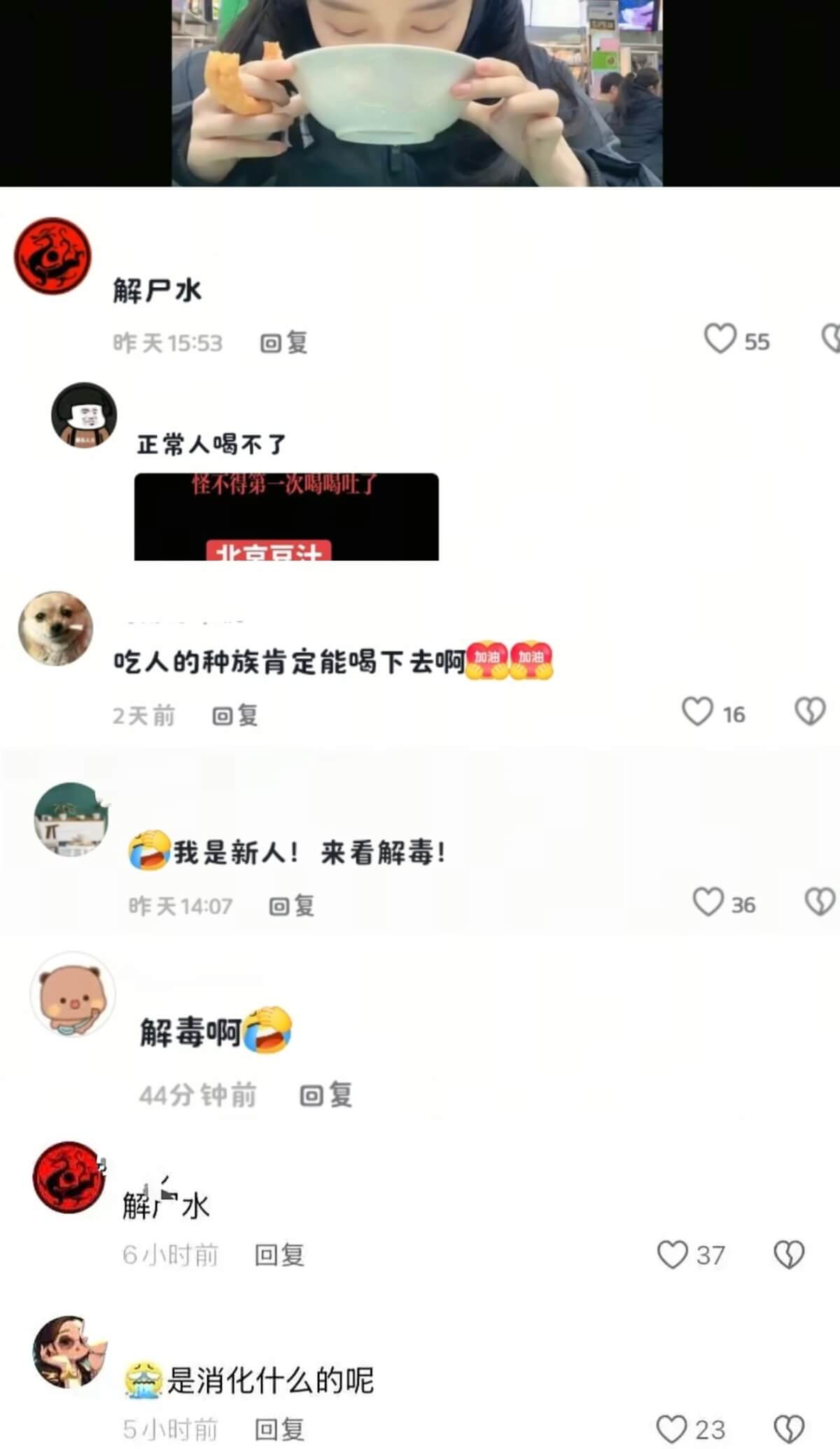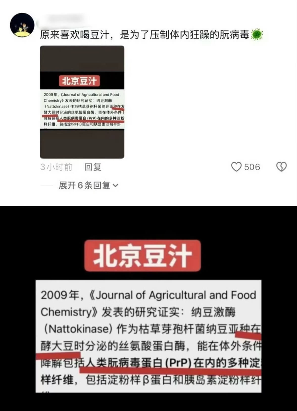 是達,原來是有人謠傳,豆汁兒裡面含有可以降解朊病毒的酶,滿族人吃完肉要喝这个。