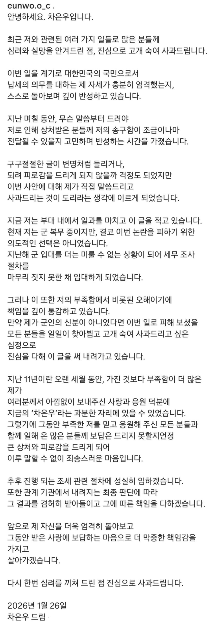 車銀優長文中向這次事件受到影響的人道歉,否認爲了迴避逃稅爭議刻意選擇服兵役時間,表示將誠實、認真地配合後續所有與稅務相關的程序,並根據相關機構作出的最終判斷,謙虛接受結果,切實承擔相應的責任。