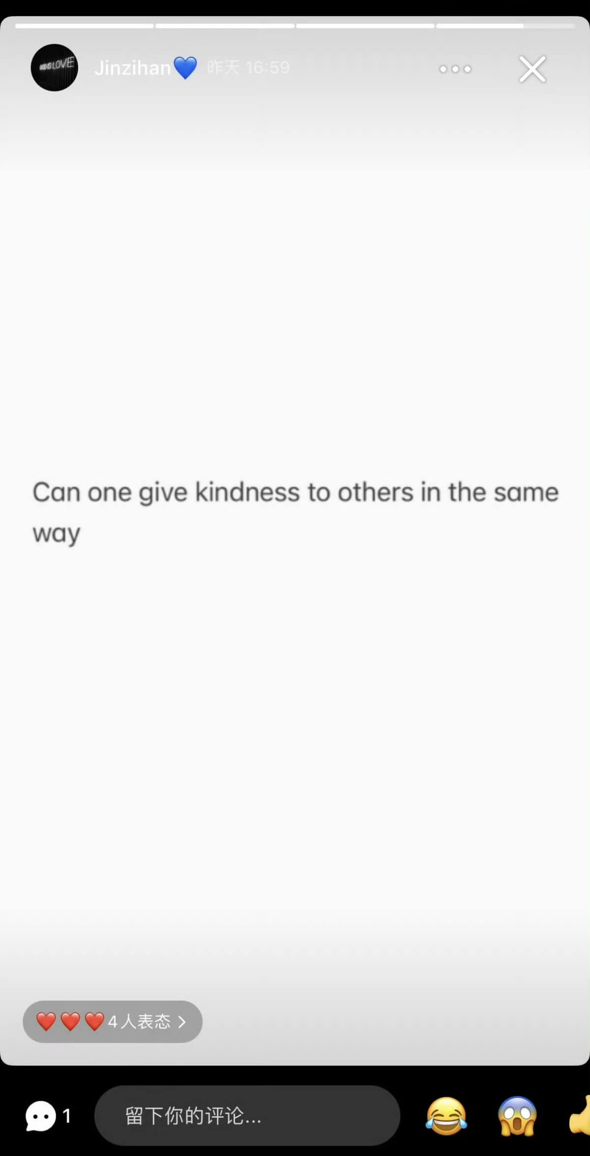 並用英文發了文案「Can one give kindness to others in the same way?」(能以同樣的方式對他人施以善意嗎?)