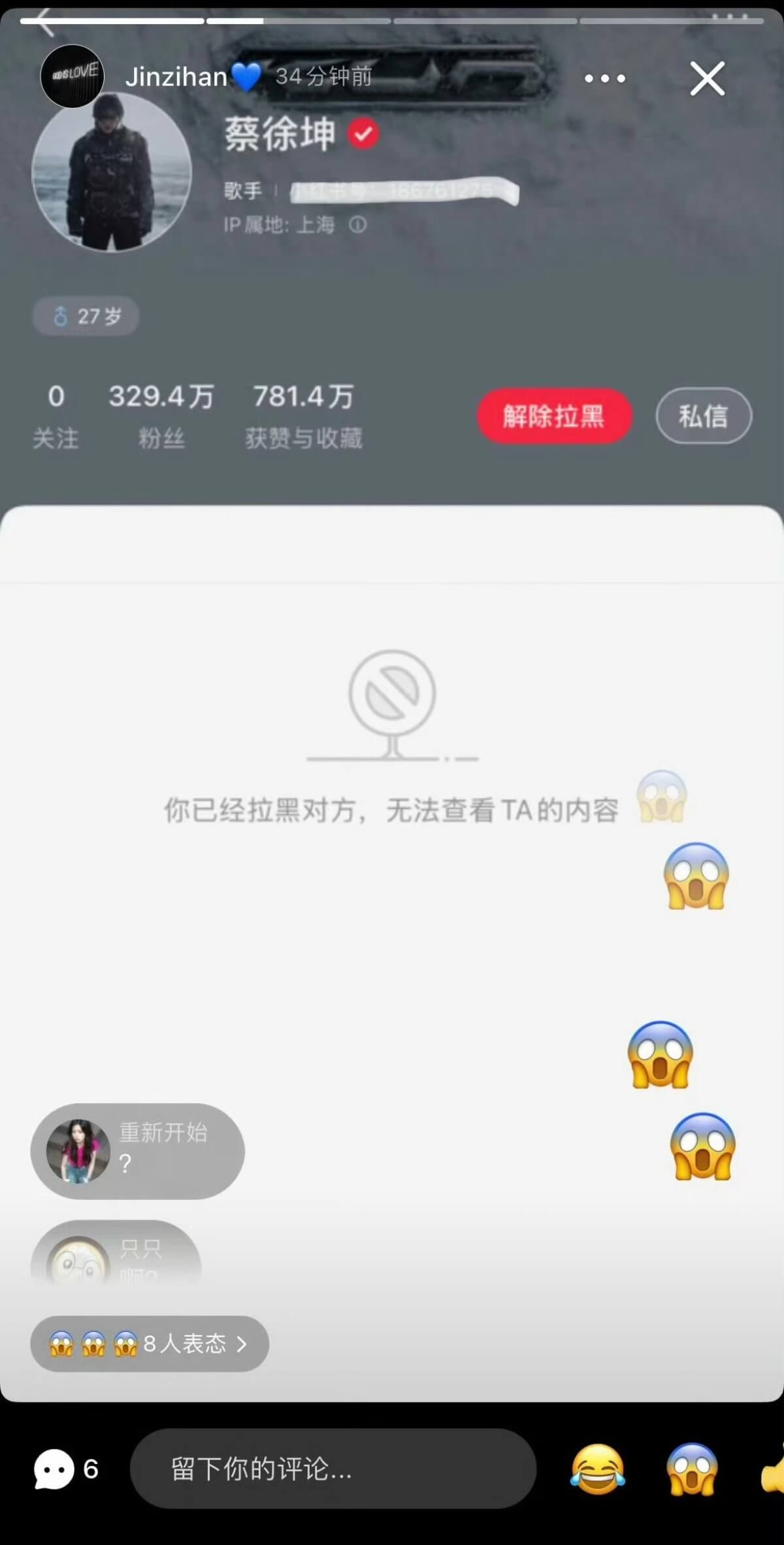 而在金子涵曬出的動態截圖,只見她拉黑了蔡徐坤👇