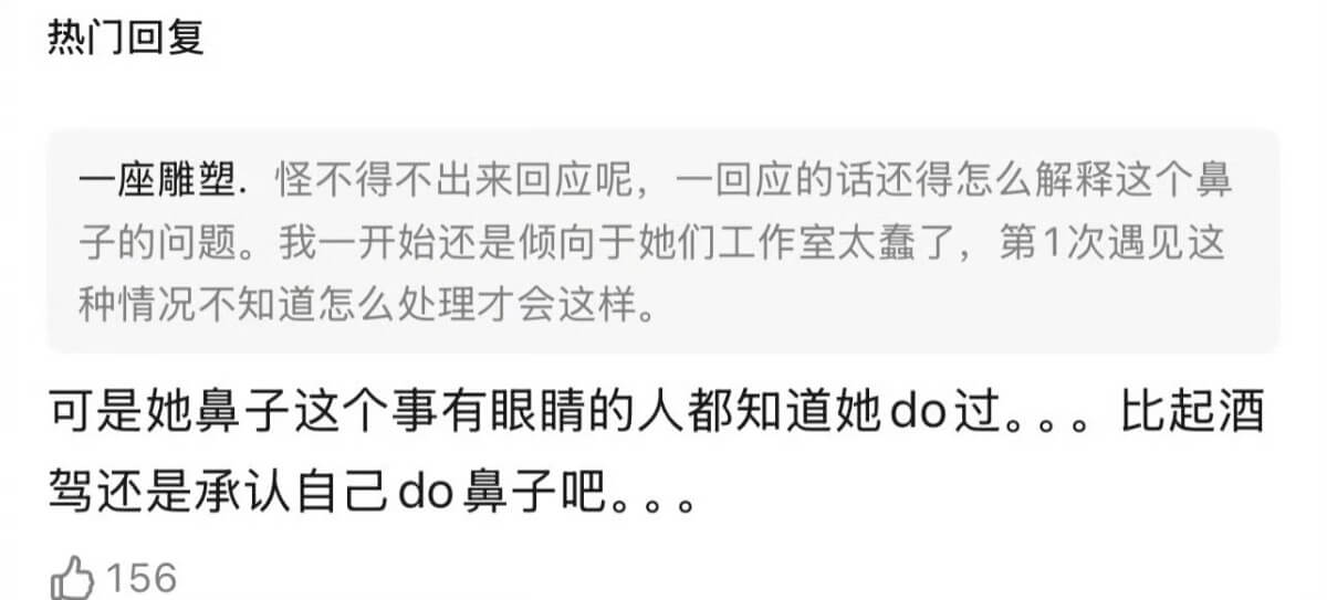 在29號晚上,還有自稱在整容醫院上班的網友爆料,表示她確實是因為鼻子問題,所以才急著離開現場!