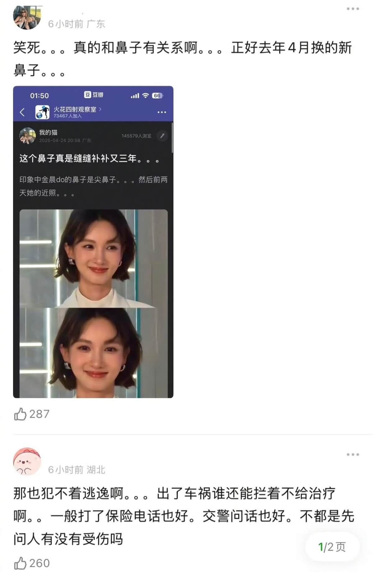 也來看看去年4月,原來一切都有跡可循,當時就有網友提及金晨的鼻子越補越難看,沒想到一年之後,還牽扯出這麼一個爭議!