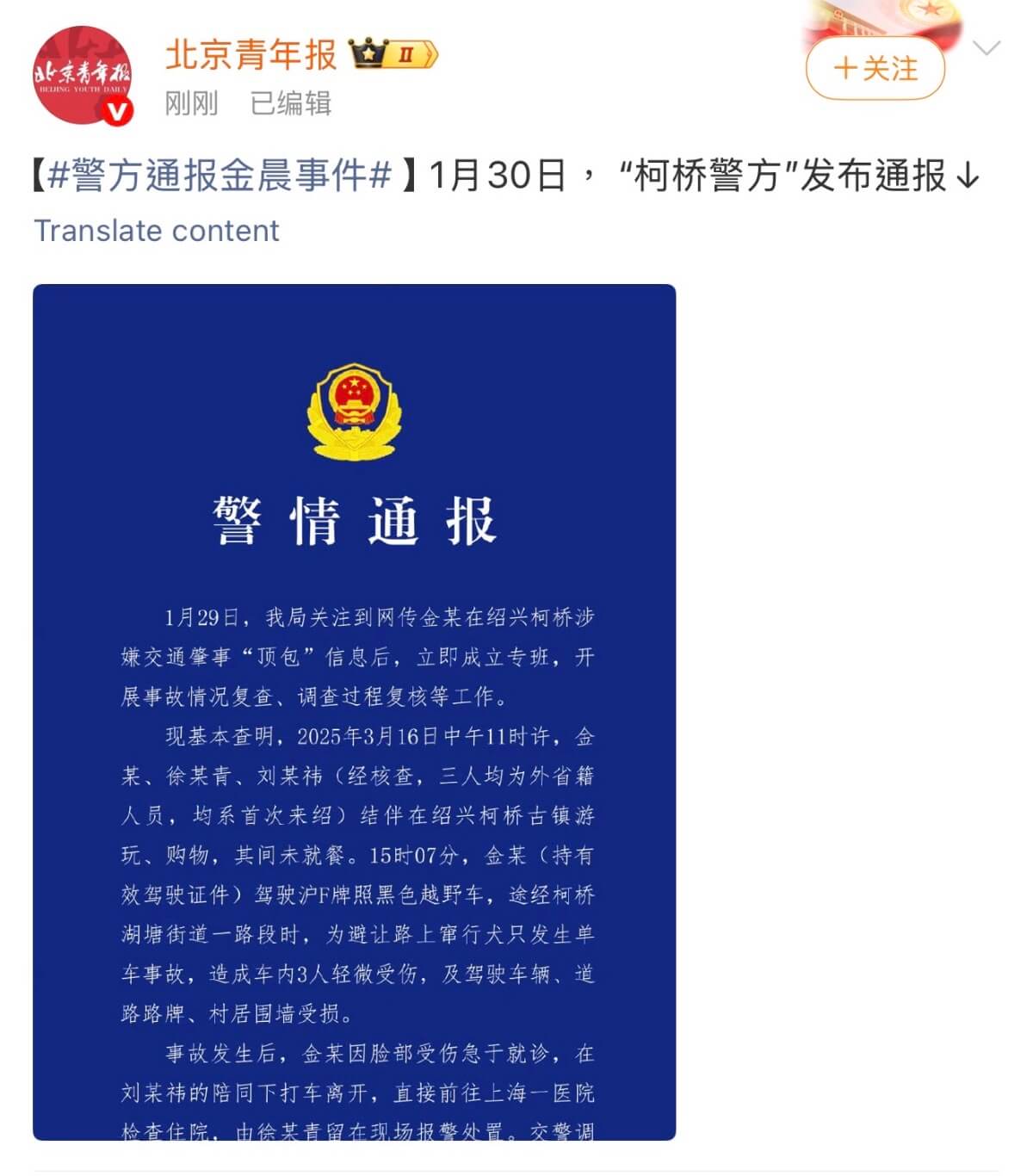 另外,網傳金晨試圖騙保,保險公司在調查期間才發現司機是金晨。而在警方通報中,提到了金晨並沒有試圖向保險公司索賠。警方通報如下👇