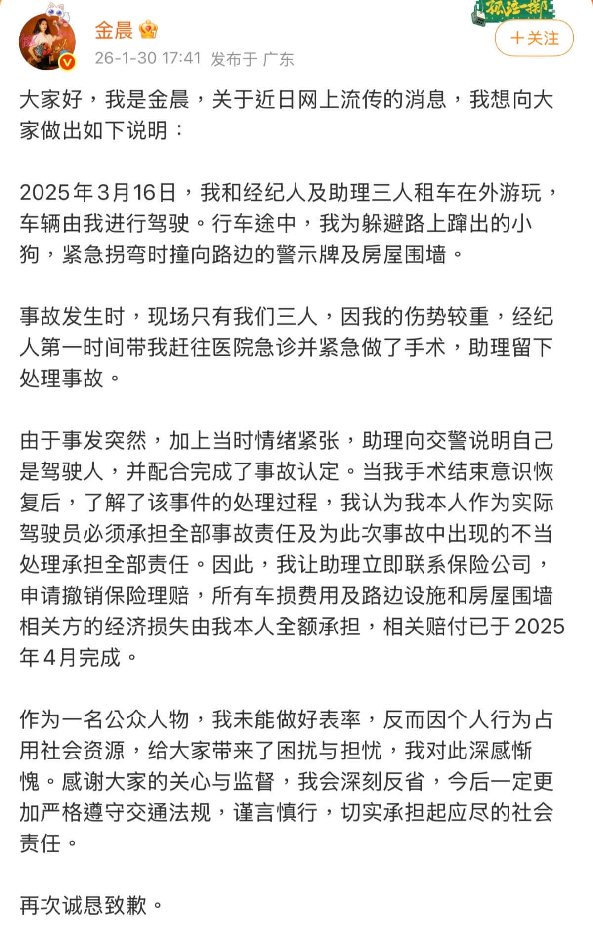 金晨隨即也發長文道歉,表示當時因為自己傷勢比較嚴重,所以經紀人才先帶自己去醫院,留下助理在現場處理事故後續。當中提到了自己在術後,第一時間聯繫保險公司撤掉了索賠,並且負責了所有意外造成的損失,包括修補了被撞的墻,並向全網道歉。