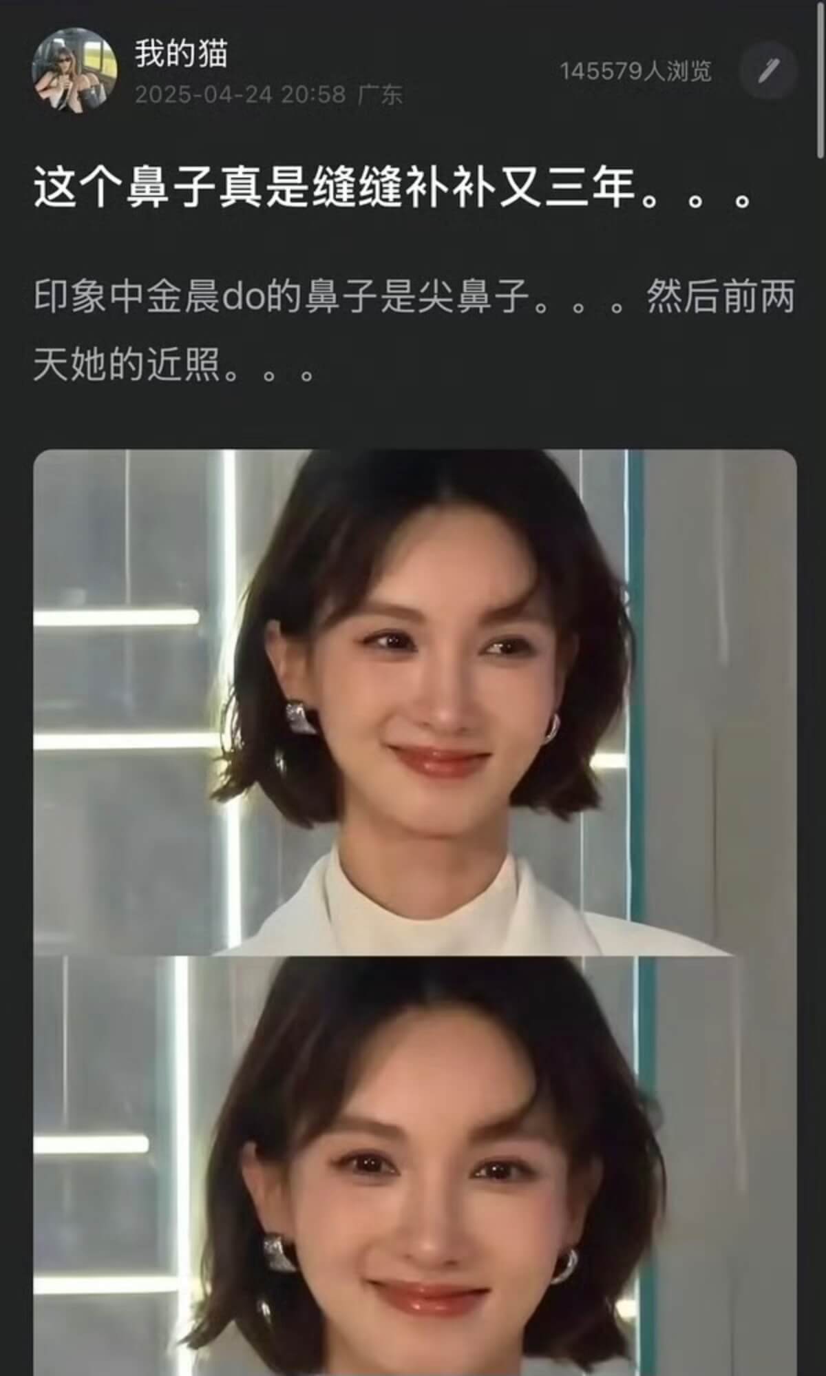 也來看看去年4月,原來一切都有跡可循,當時就有網友提及金晨的鼻子越補越難看,沒想到一年之後,還牽扯出這麼一個爭議!