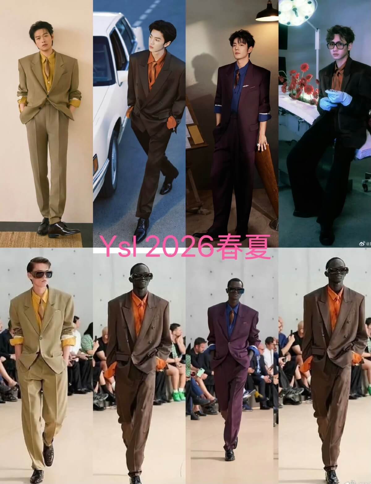 是噠,當中汪蘇瀧和陳哲遠不但同款還同色,而魏大勛和肖戰則屬於同系列!這幾套衣服都屬於YSL2026春夏系列:紅的、棕的、黑的、黃的,半個內娛都在穿同系列,撞衫撞得像大型團建現場!