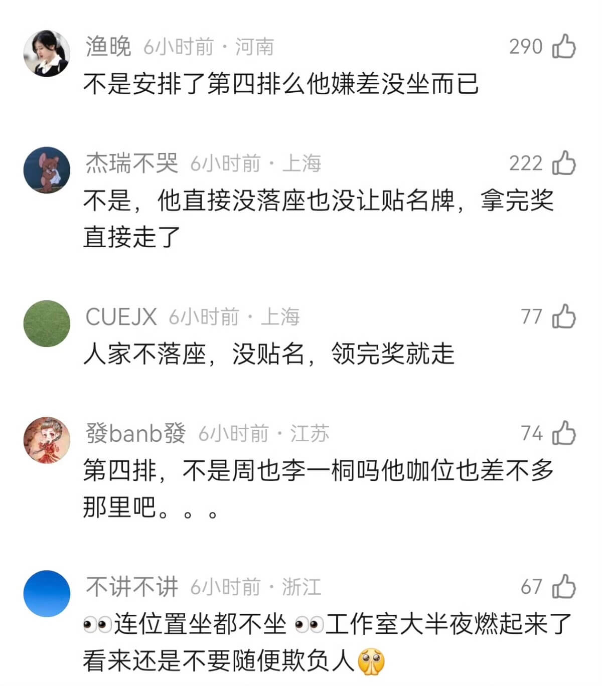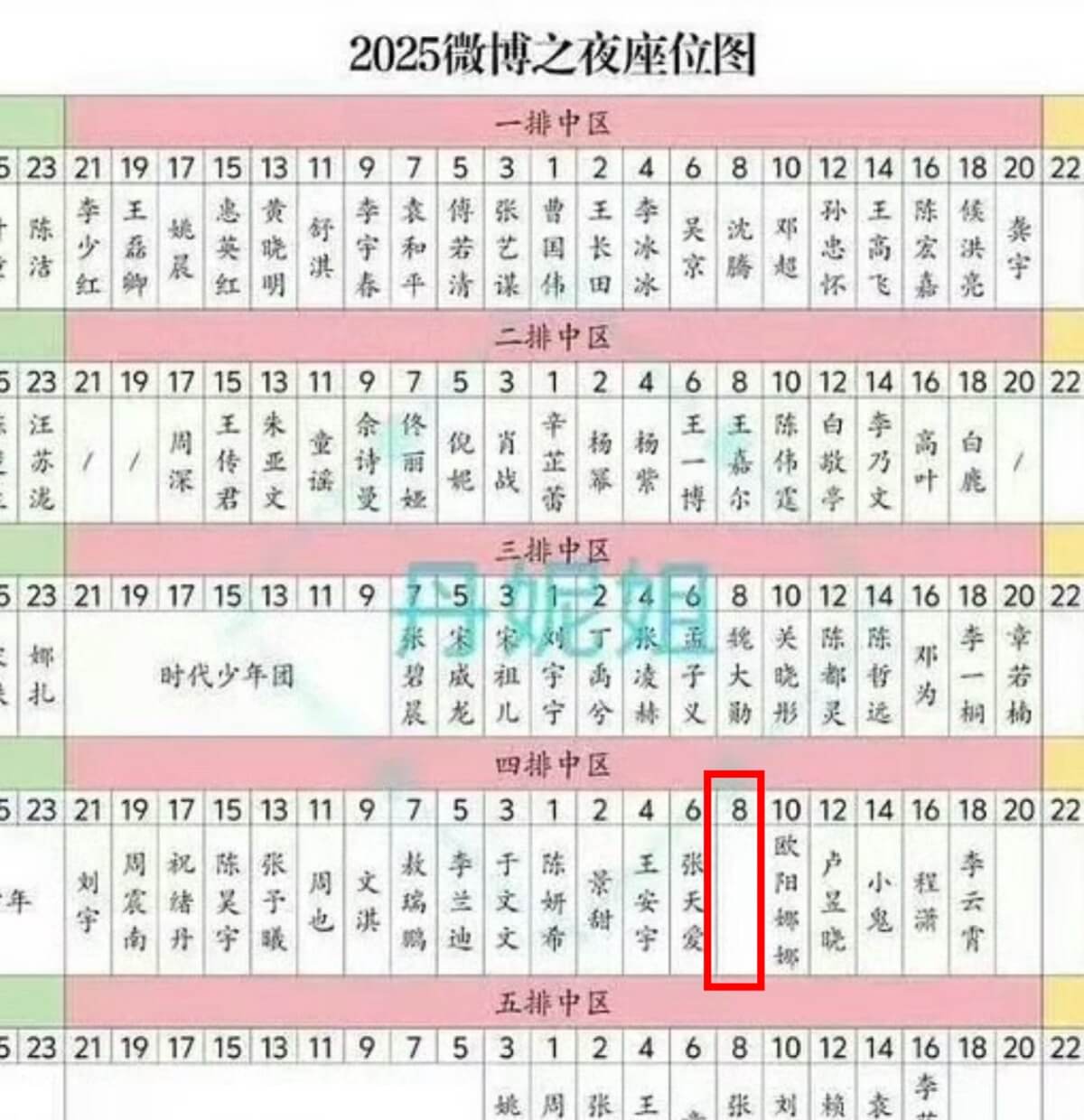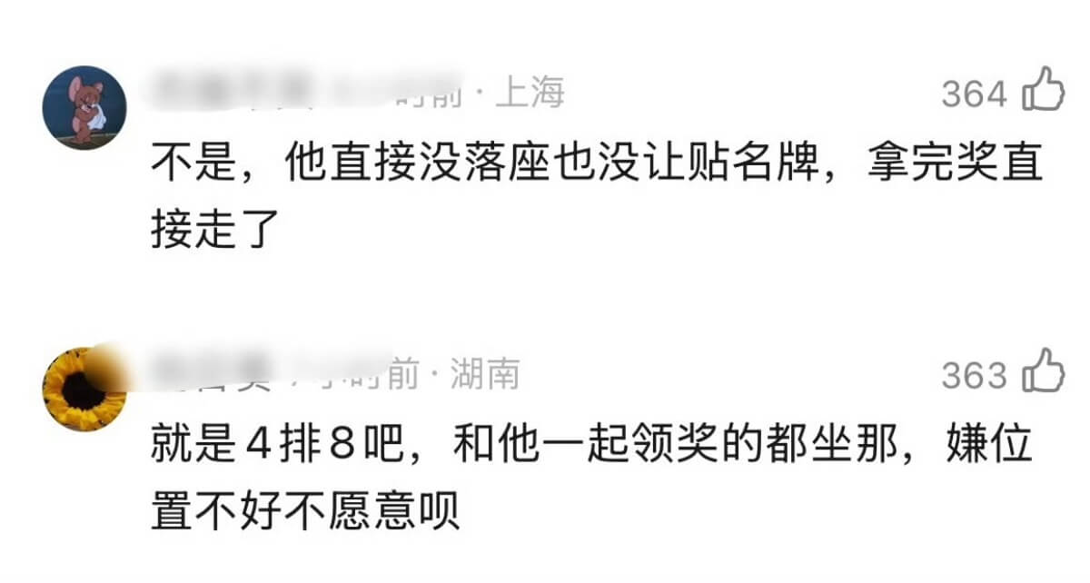 來看看,座位表上面確實沒有他名字,但網傳他的位置應該是在第四排8號,但因為不滿意所以直接拒絕落座,這個位置也確實沒有被標註上名字👇