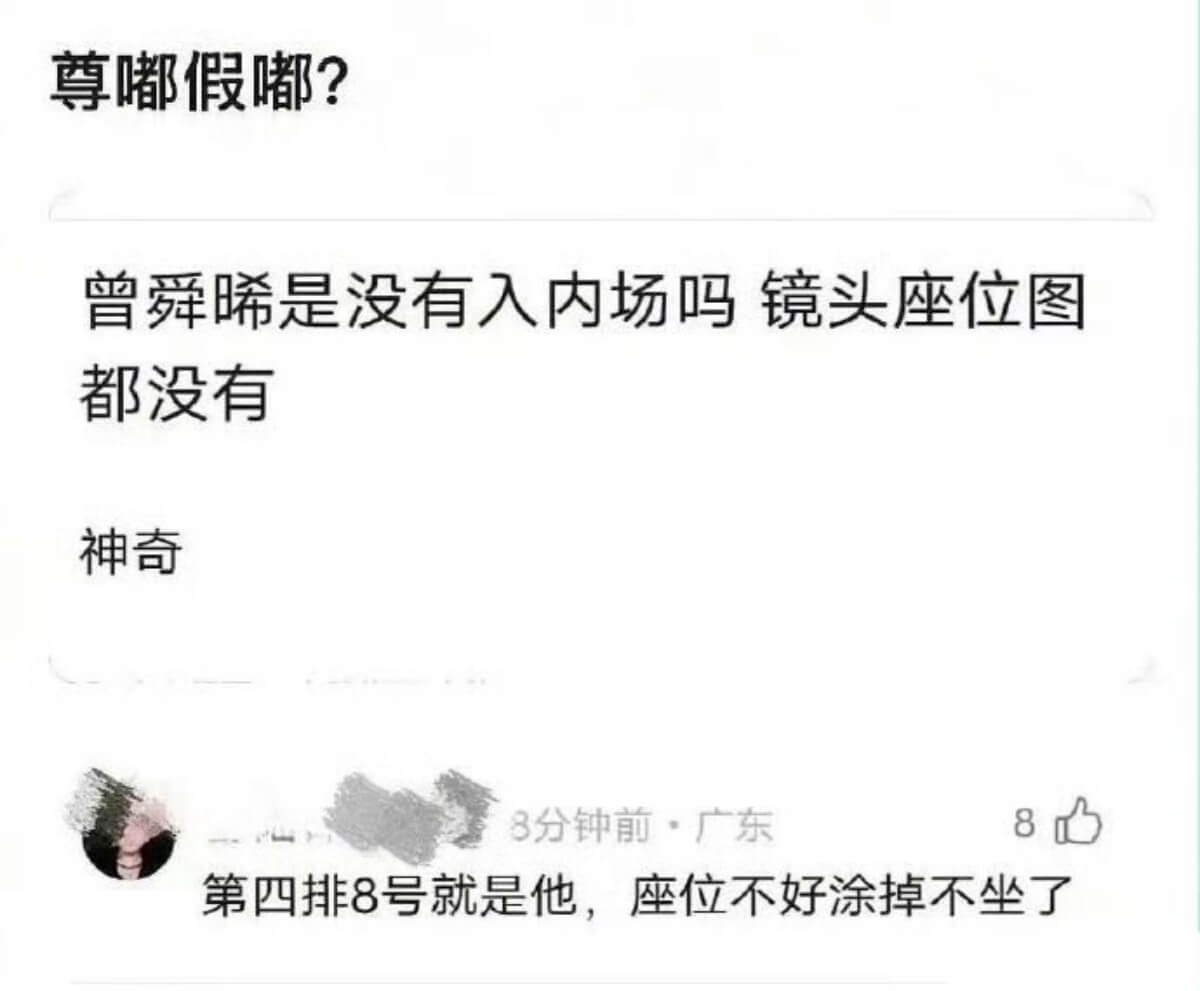 事實上當晚還有不少瓜,其中一個就是網友發現,曾舜晞雖然出席了《微博之夜》,但是座位表上找不到他的名字👇