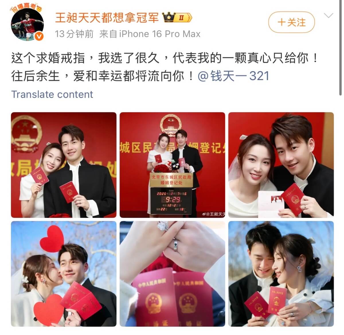 沒想到2026年才踏入二月,今年未滿25歲的王嬋就發文,曬出自己和錢天一的領證照片,官宣…結婚啦!!