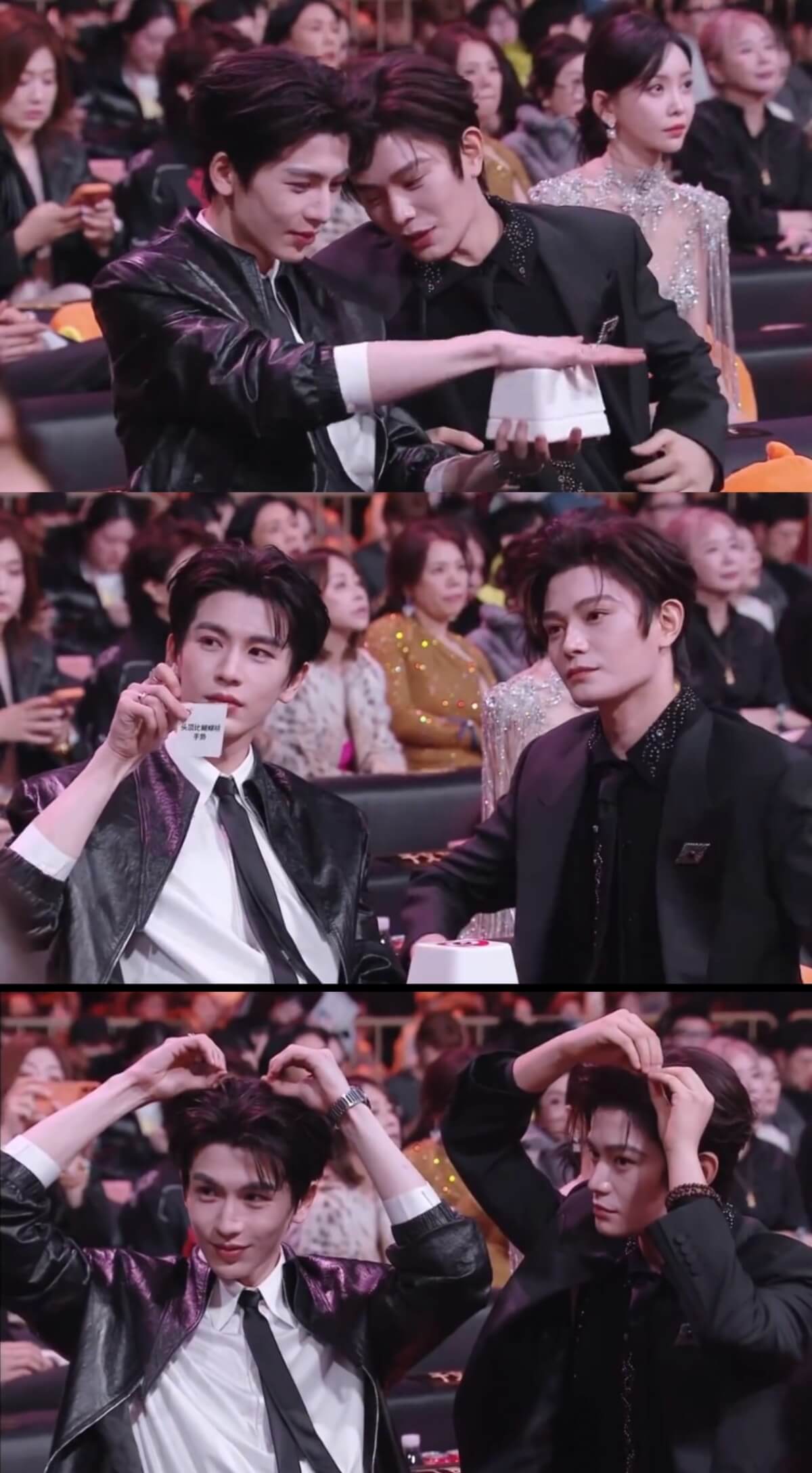 是噠,這兩個在《微博之夜》坐在一起,還被安排一起玩遊戲,在台下做出萌死人的蝴蝶結手勢👇