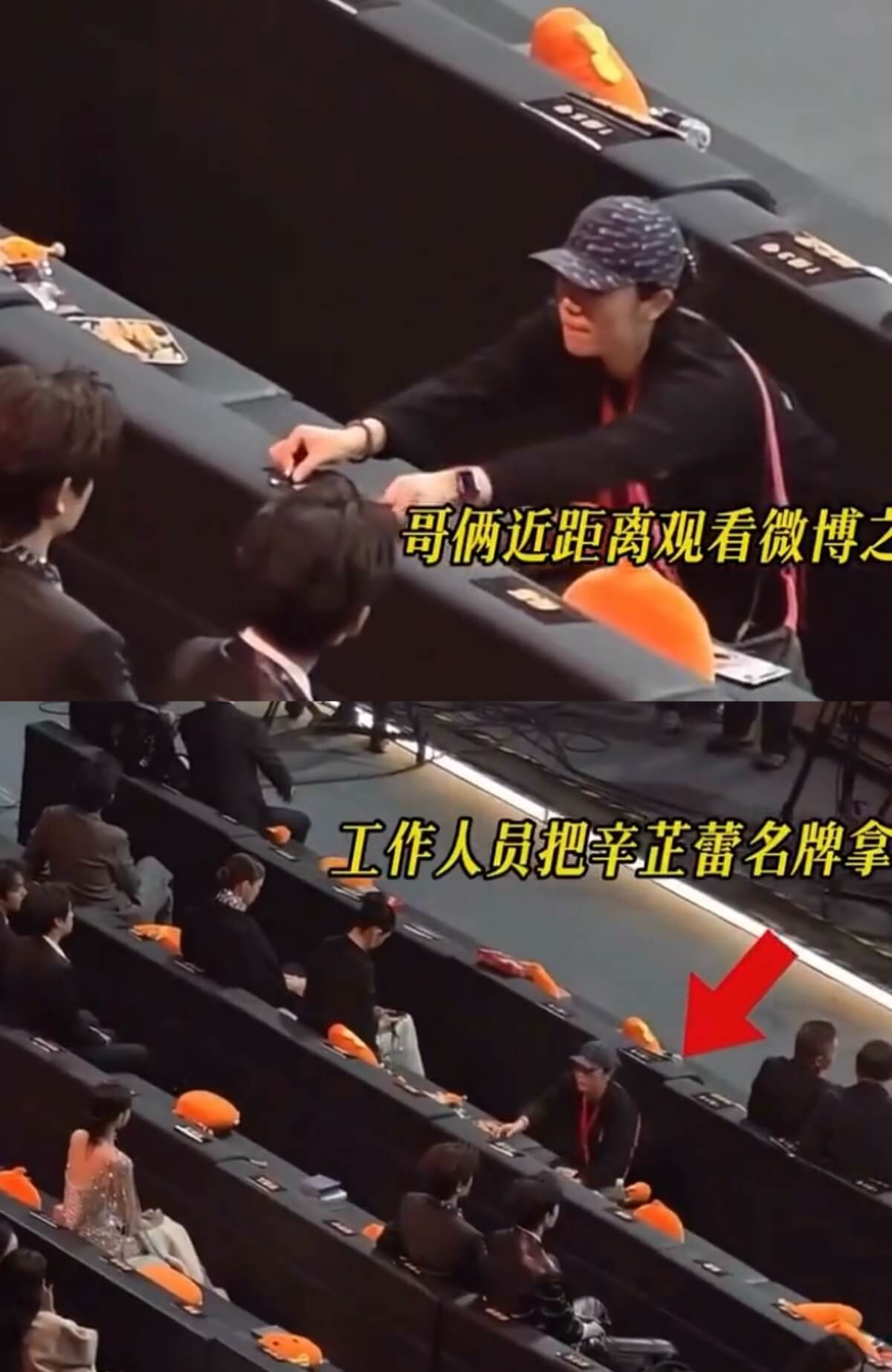 但有網友公開了現場影片,原來兩人在扮萌之前,正在見證工作人員如何緊急補救!來看看,兩人發現工作人員來撕走了「辛芷蕾」的姓名貼👇