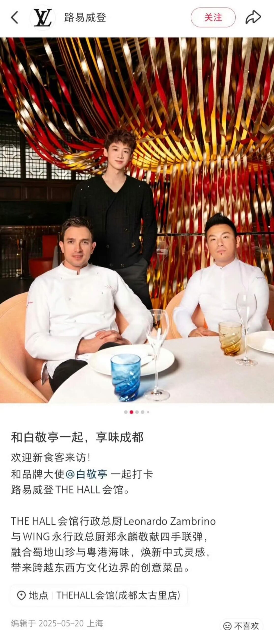 但隨後網友扒出,白敬亭這家是他在25年5月,在成都出席LV品牌活動所拍!這家位於成都太古裡THE HALL會館的品牌活動,該餐廳是當時全國唯一的LV主題餐廳。