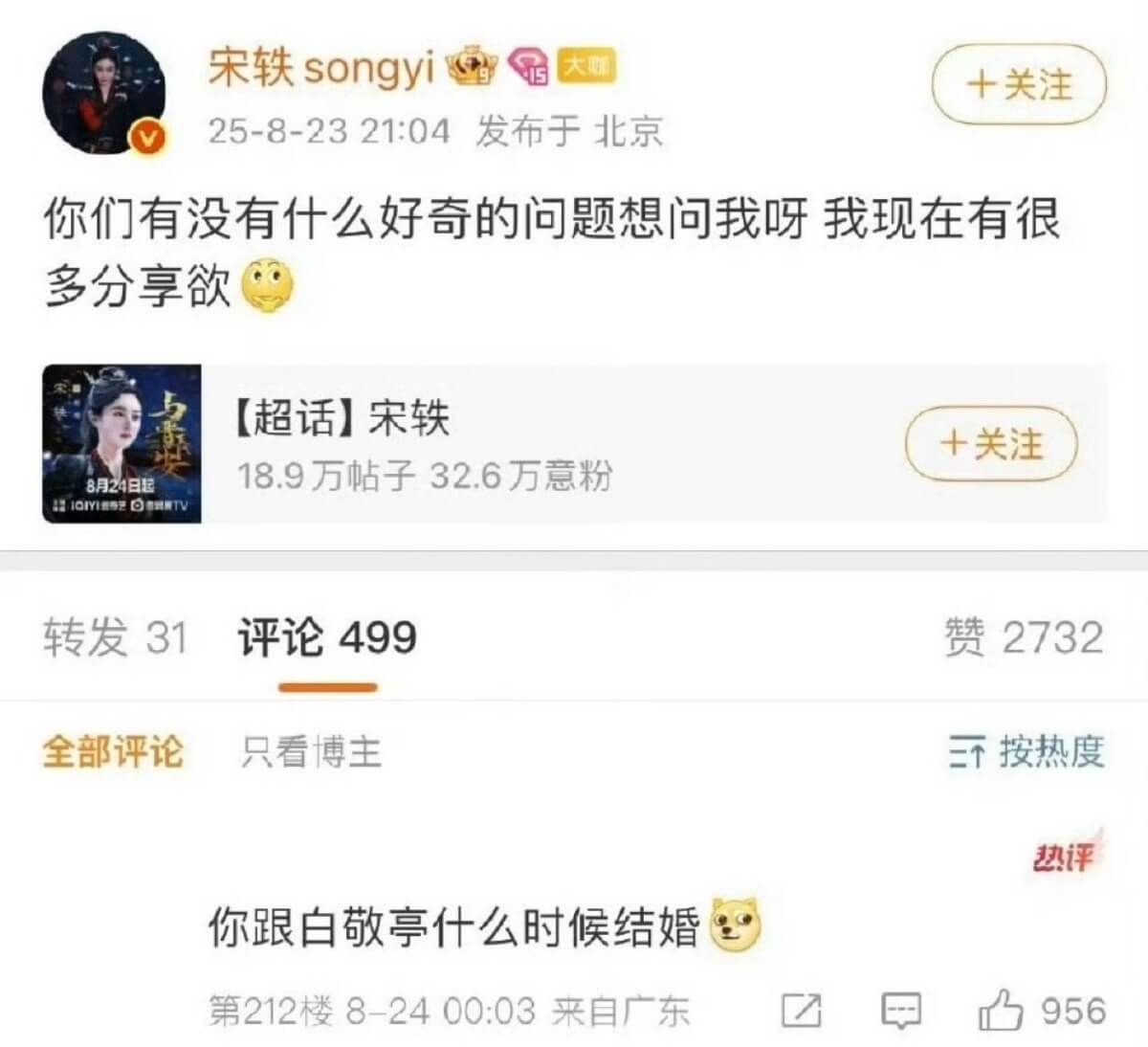 去年八月,宋軼曾在微博發帖和粉絲互動,熱評第一的網友問她什麼時候和白敬亭結婚?結果宋軼不但沒有回答,還直接刪除了整條微博👇