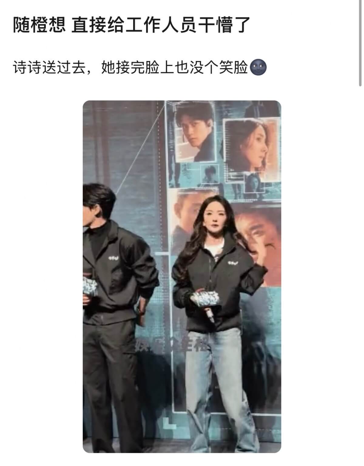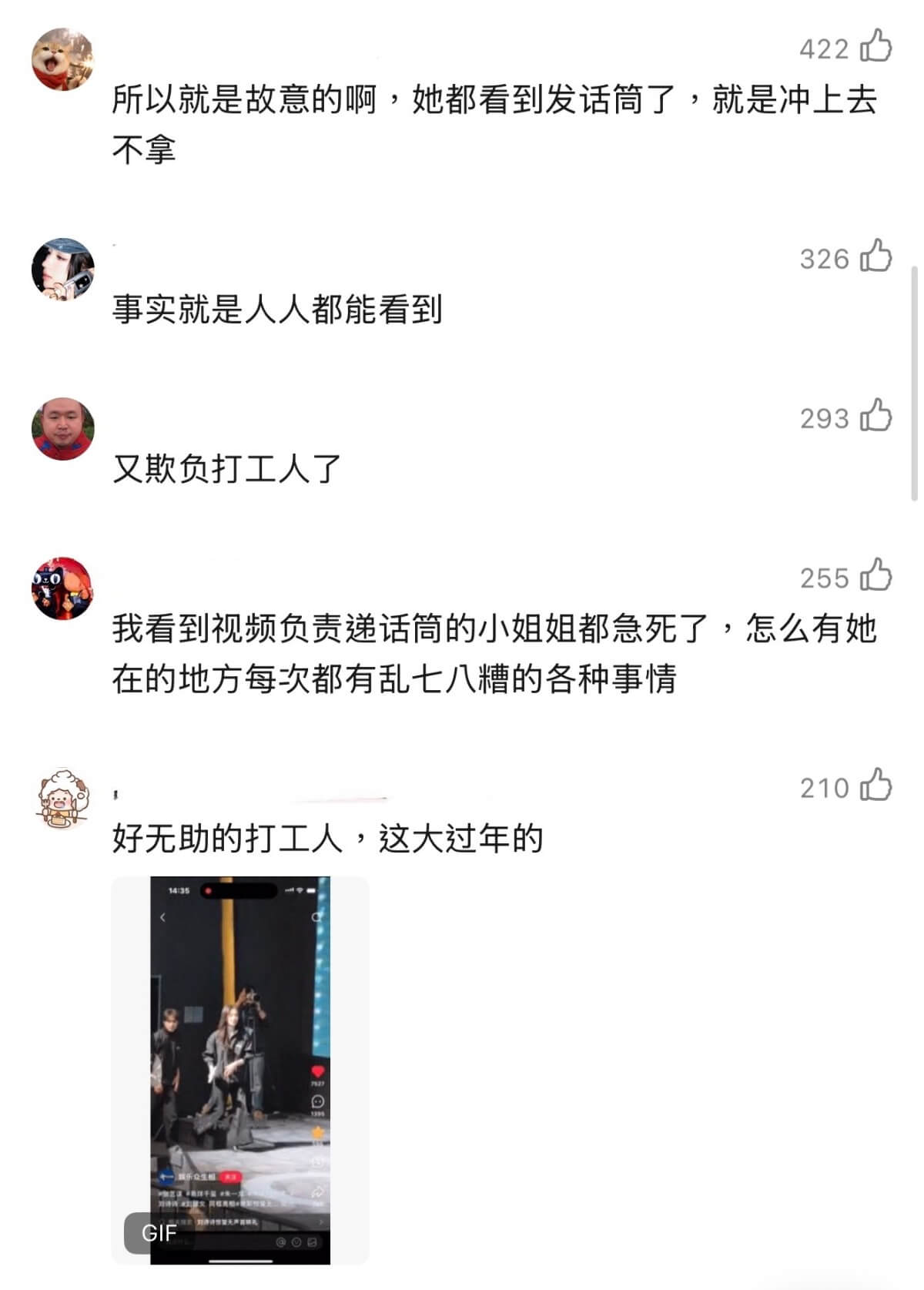 工作人員看得出十分著急,隨後登場的劉詩詩發現了,立刻幫忙工作人員接過麥克風,並遞給了楊冪!