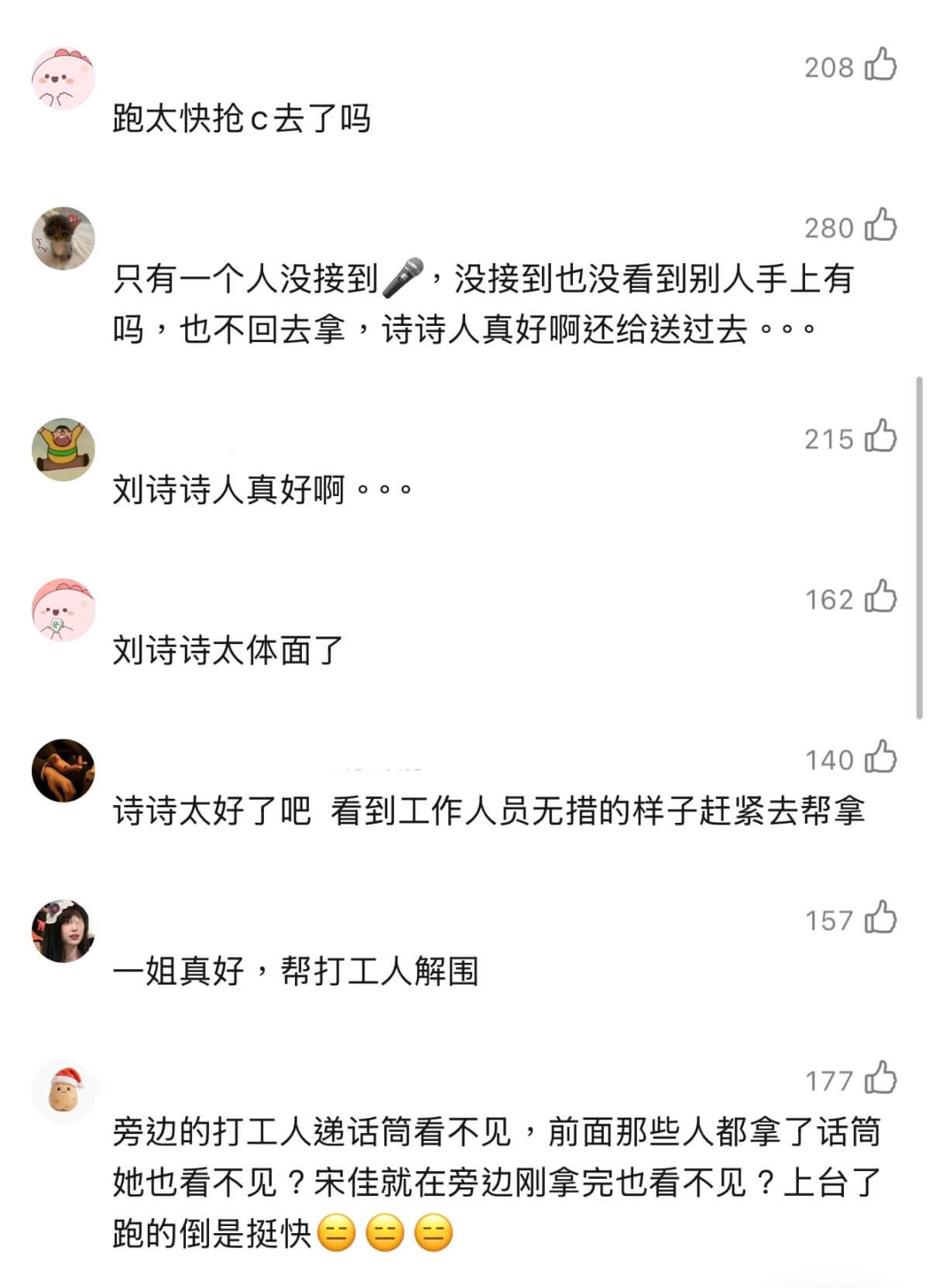 工作人員看得出十分著急,隨後登場的劉詩詩發現了,立刻幫忙工作人員接過麥克風,並遞給了楊冪!
