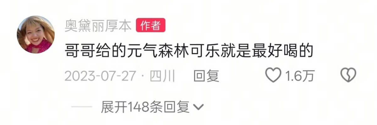 當時有網友評論:「這是某版人間煙火嗎?」厚本本人還回覆:「哥哥給的元氣森林可樂就是最好喝的」,直接呼應了視頻中的玩梗內容,坐實了她對宋焰黑梗的主動參與。