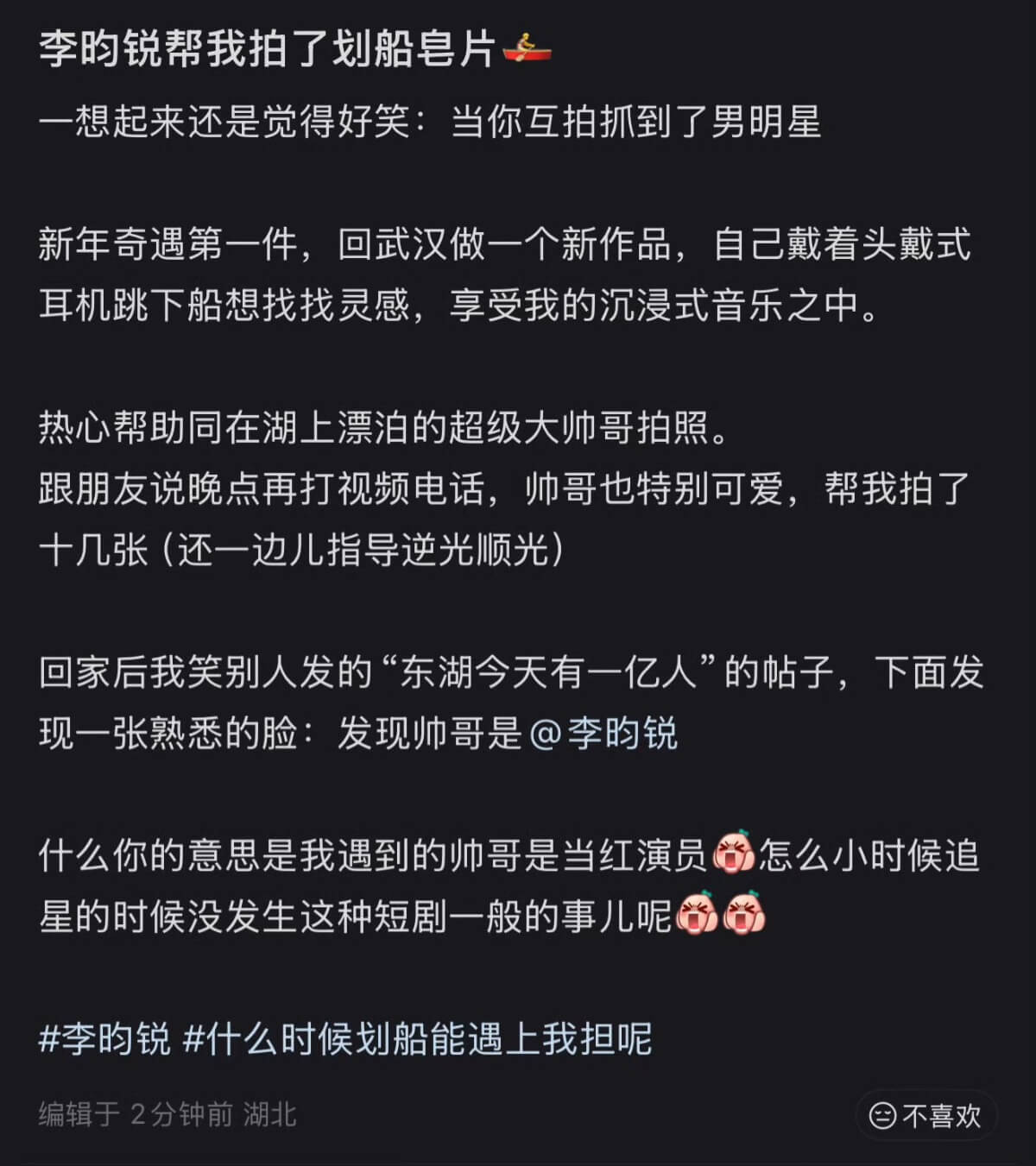 沒想到的是,不僅和偶遇的路人合照,甚至還幫忙拍照?是噠,有網友分享了自己在東湖划船時,遇到一名同在湖上漂泊的超級大帥哥,兩人互相拍照後,原Po回家才發現對方居然是李昀銳!