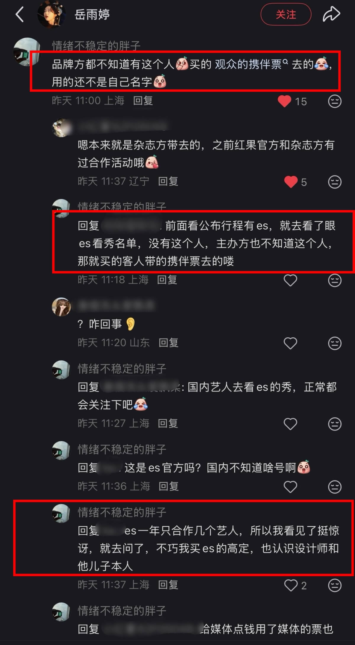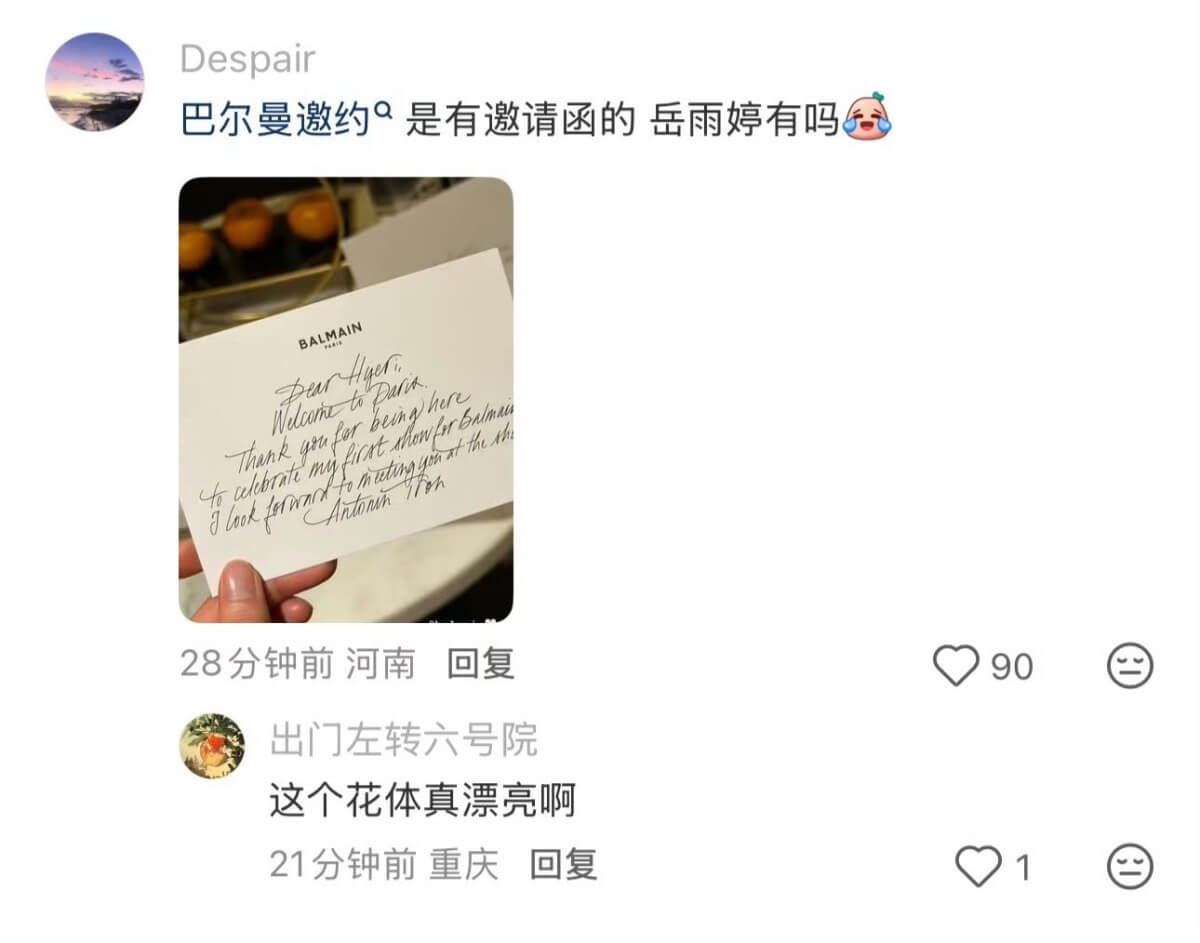 事實上,早在BALMAIN開秀前,就有「人脈哥」在岳雨婷的評論區爆料,她沒有被品牌方邀請,甚至出發圖的衣服都是自己買的👇
