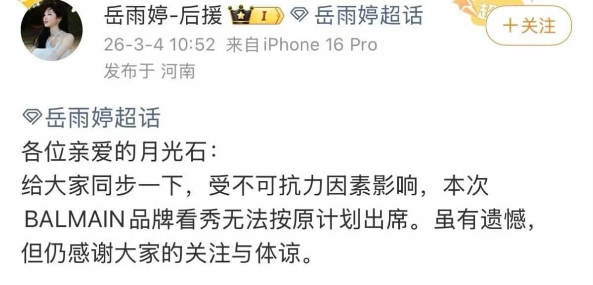 正當粉絲期待她閃耀巴黎時,突然對接方發了聲明,表示她因「不可抗力因素」,所以即將缺席四號這天的時裝秀👇