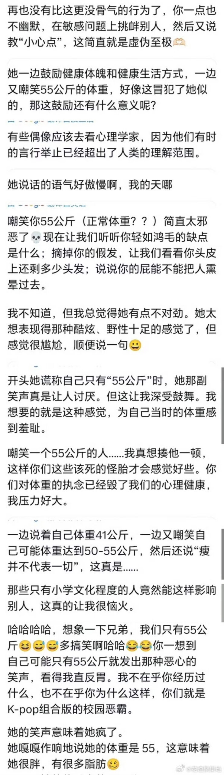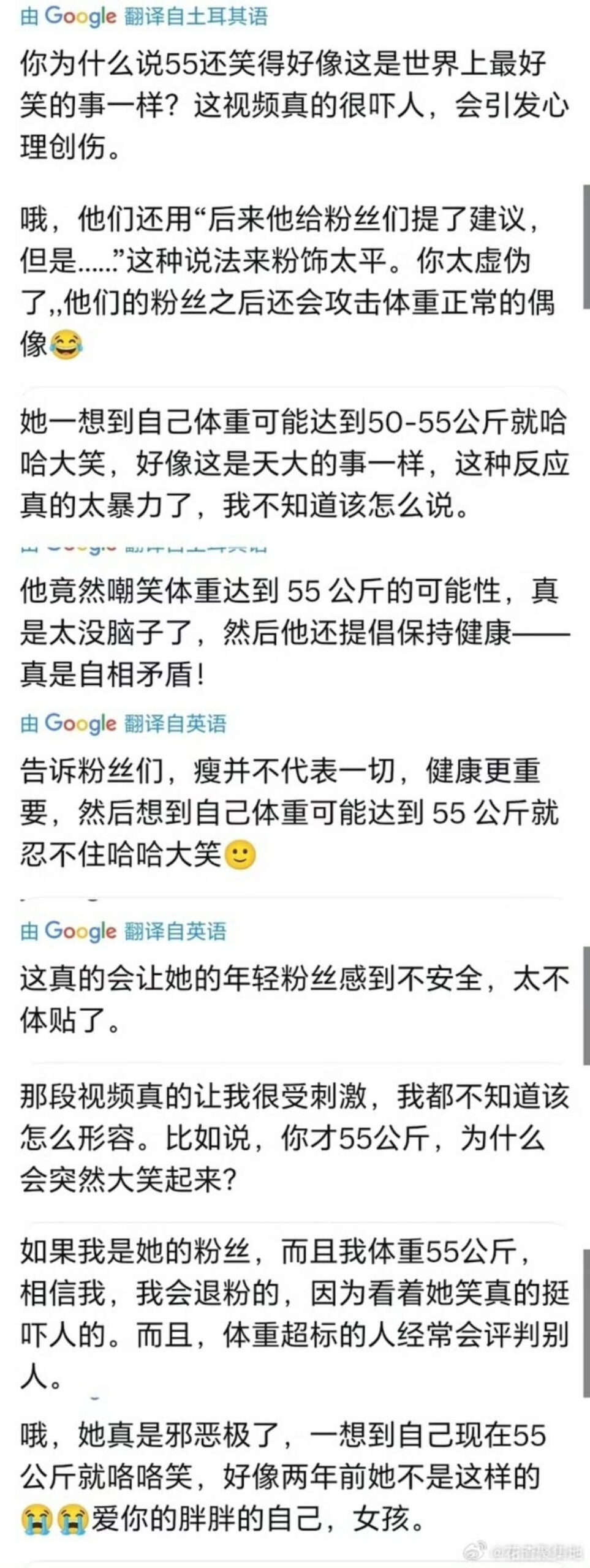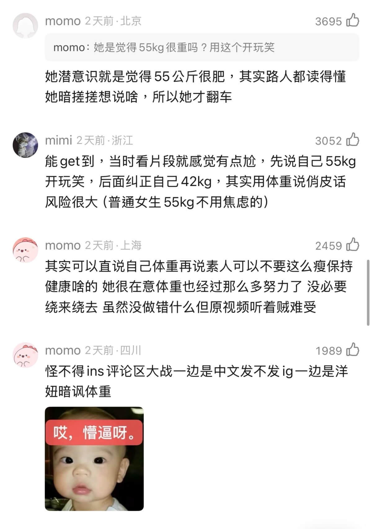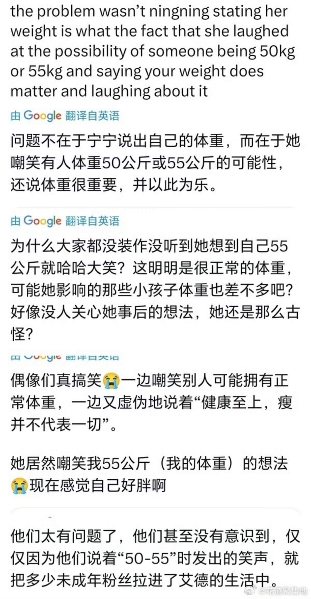 但在這期間,寧寧先是說了自己有55公斤,工作人員表示不相信,她狂笑了一頓之後才讓工作人員猜。也就是這個說反話的操作,在海外引起了極大的爭議,認為她將一個女孩的正常體重,視作為笑話!來看影片👇