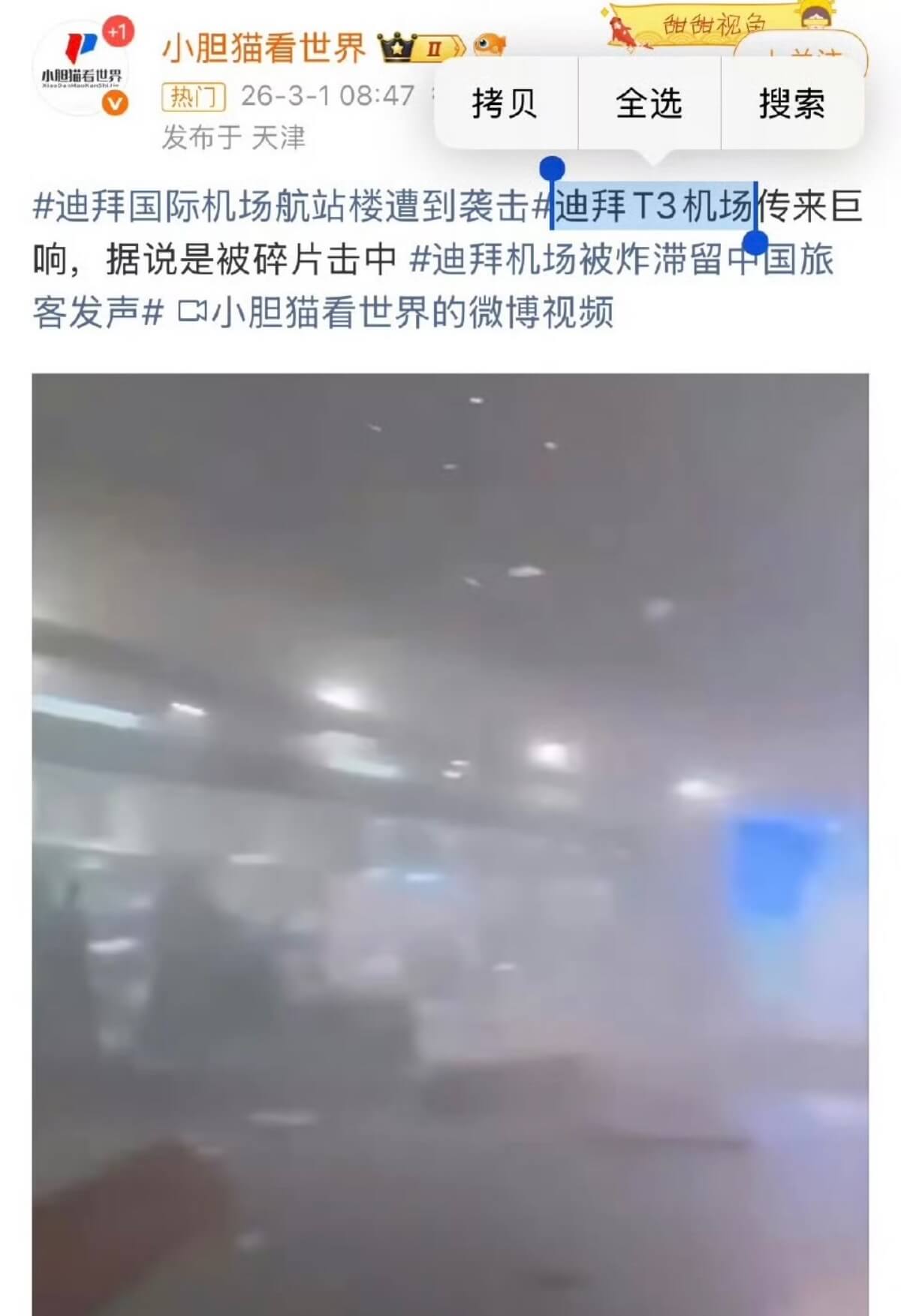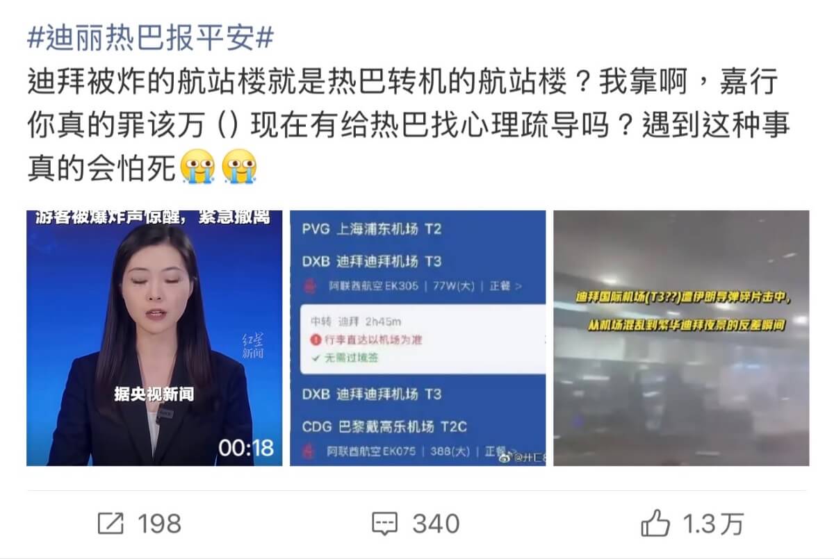 粉絲發現,熱巴轉機的時間段,其轉機的迪拜第三航廈,正好碰上導彈碎片擊中👇