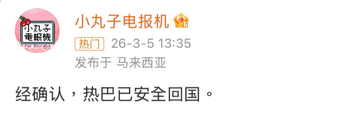 而五號這天的最新消息,則是熱巴已經安全回國,讓粉絲們終於放下心頭大石。