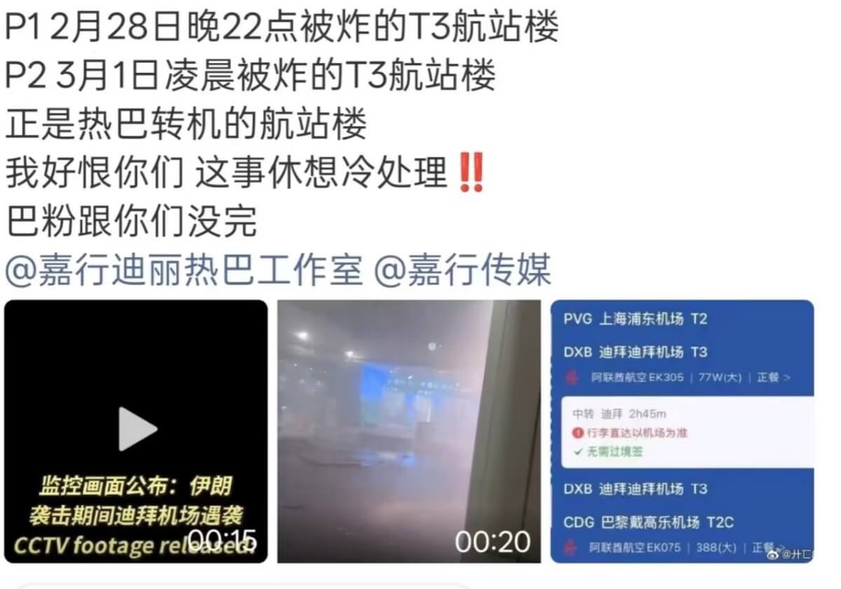 對於這次工作室的謎之操作,粉絲們紛紛表示不能原諒,尤其當發現熱巴轉機時,正好碰上了迪拜航廈被炸👇