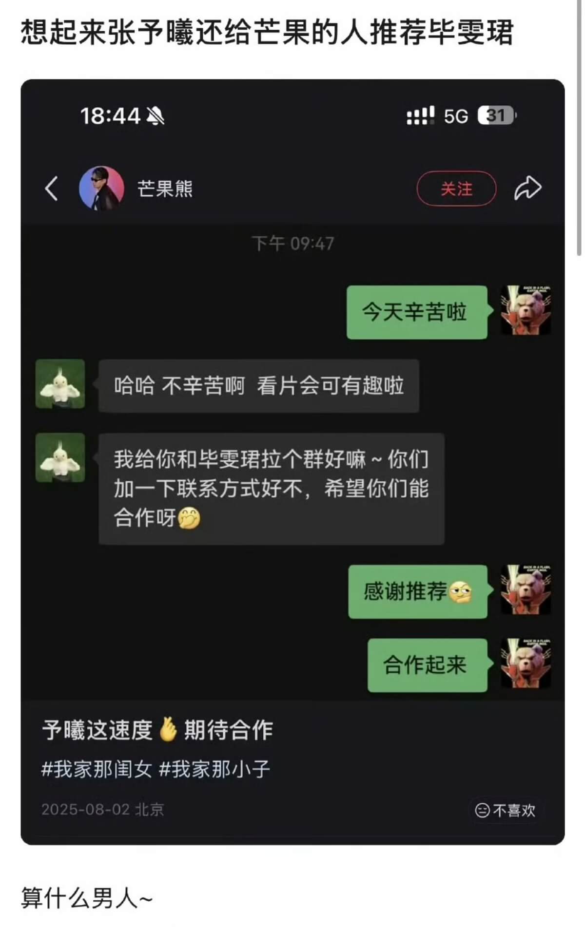 而網友普遍也認為,之前張予曦還介紹了綜藝《我家那閨女》給畢雯珺參與,結果他居然轉頭就這麼背刺!