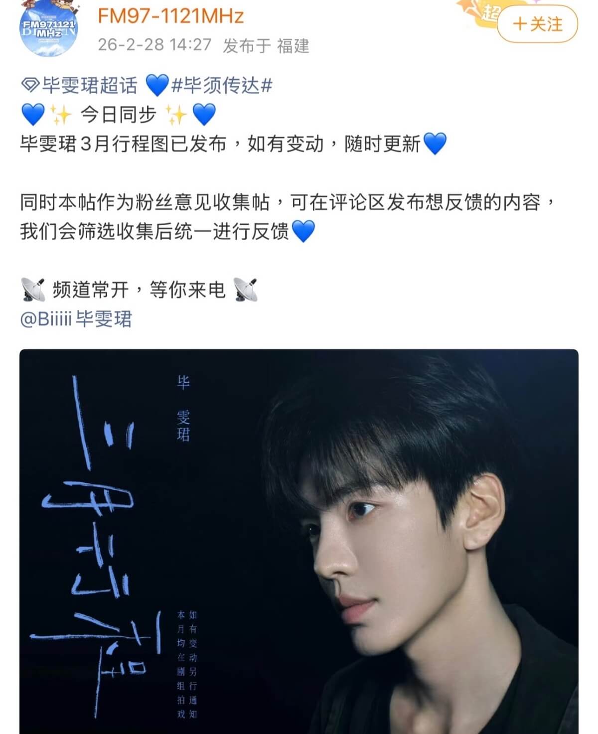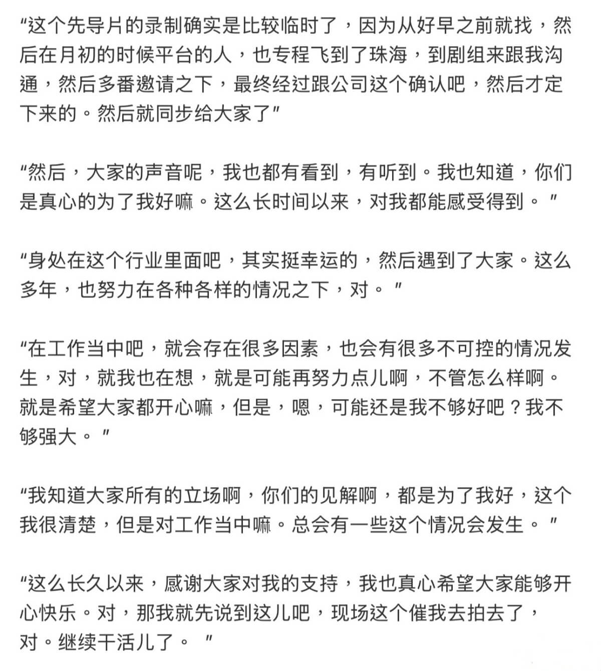 隨後畢雯珺趁拍戲休息間隙,在自己的粉絲付費交流小程序上發語音解釋,臨時錄製是因為平台方面多次邀請才確認的,他知道粉絲的擔憂,但工作中擁有很多不可控的情況:「可能還是我不夠好吧?我不夠強大。」