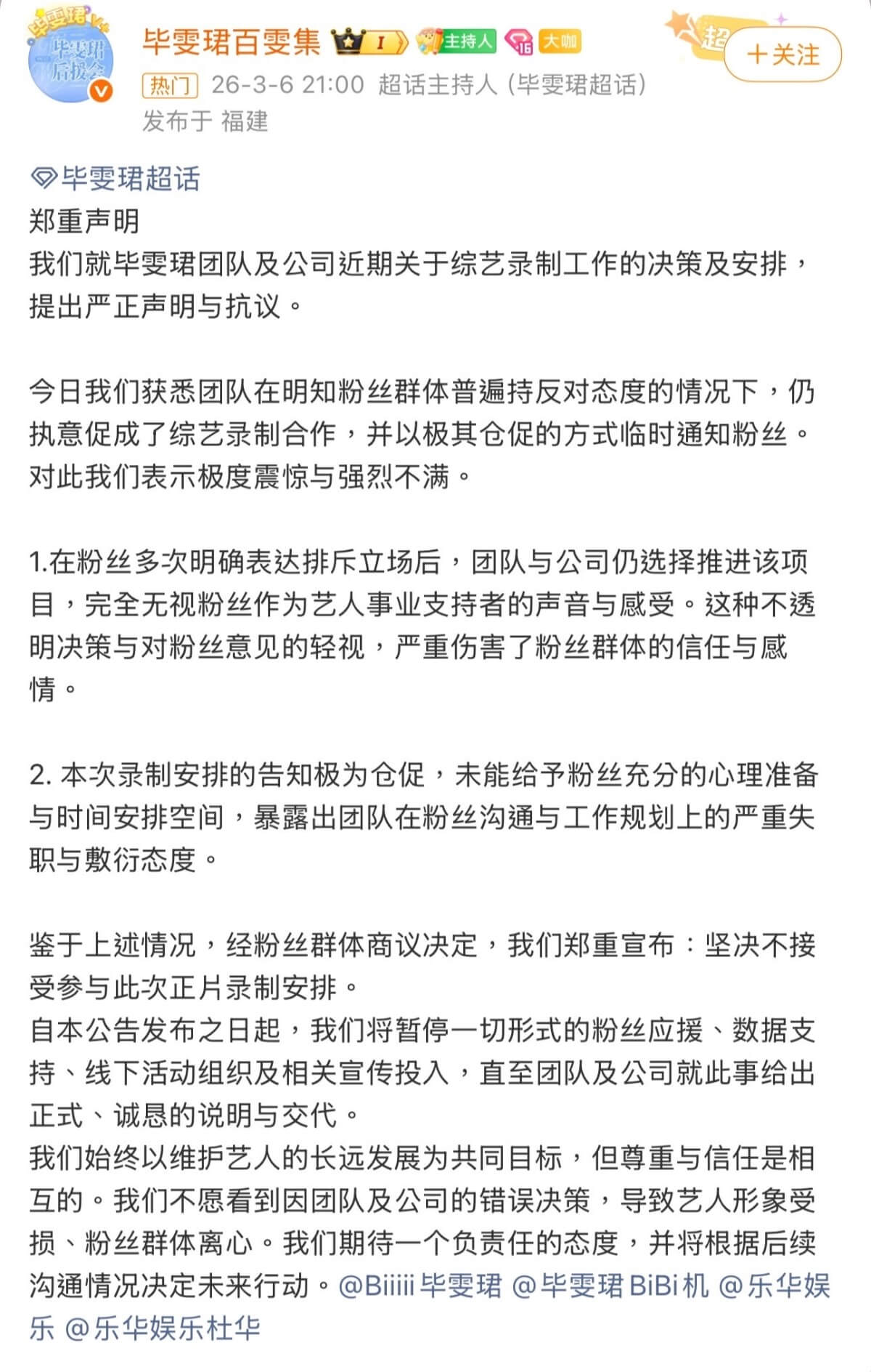 之後畢雯珺粉絲發聲明喊話樂華,說分手都明確反對合體,公司還是接了工作並且倉促告知,要暫停粉絲應援和各種支持,直到團隊就此事給出正式交代。