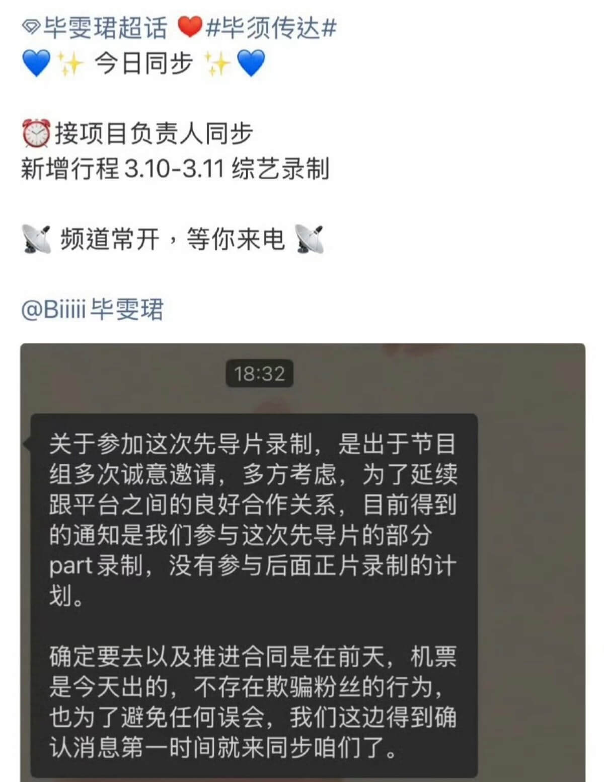 對接號也同時附上了一張溝通截圖,說明畢雯珺是因為節目組多次邀請才點頭應允,這次也僅參與先導片錄製。