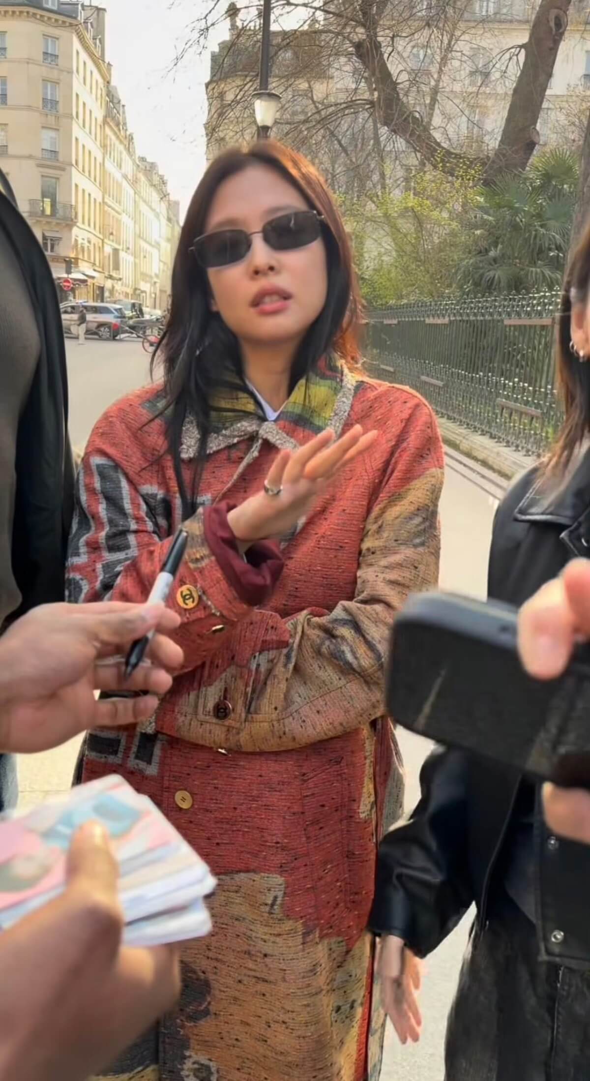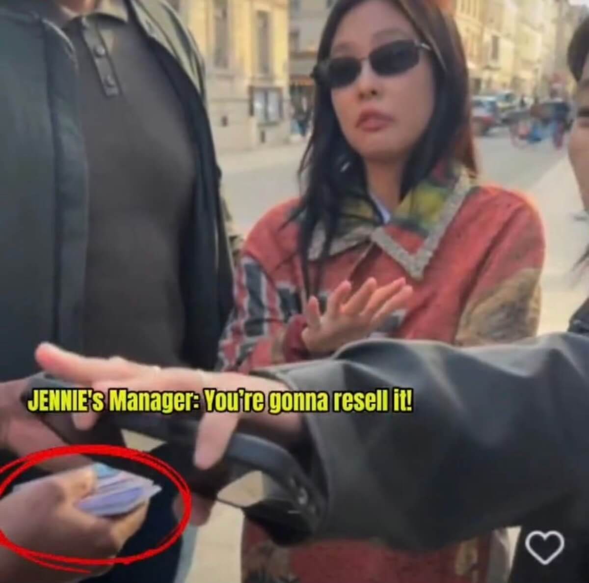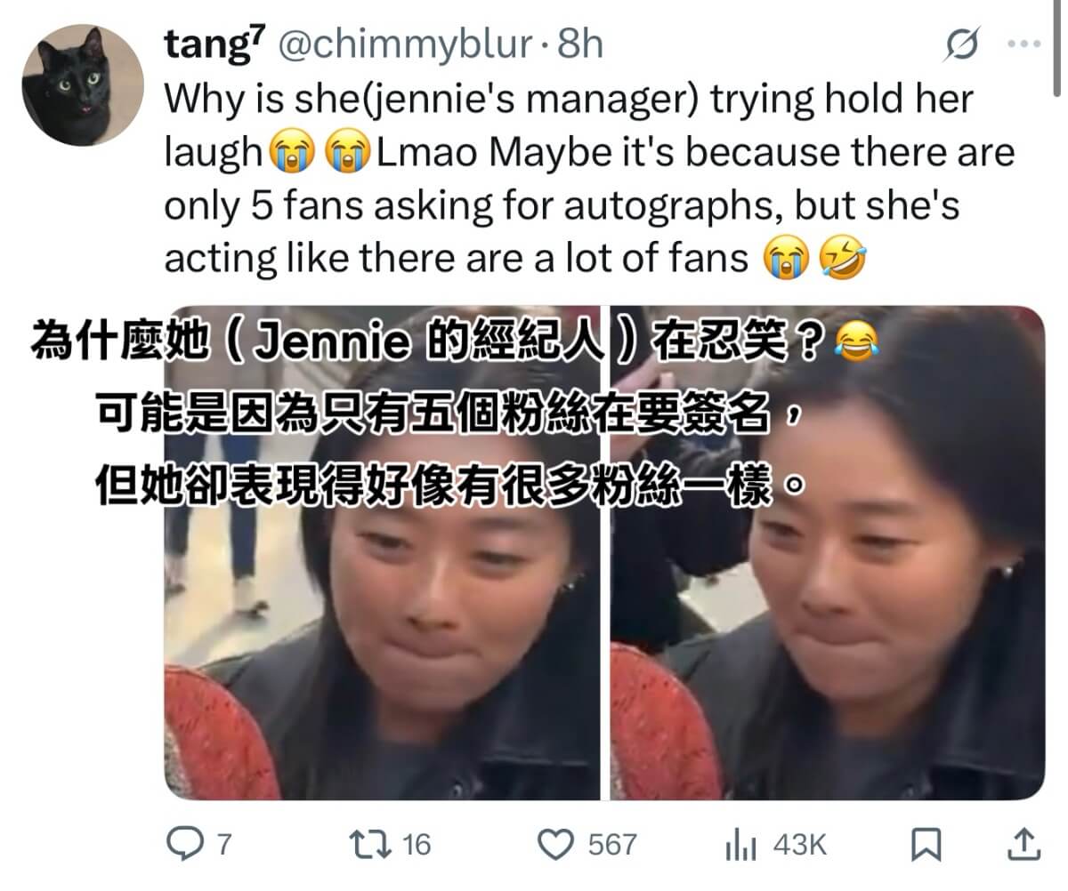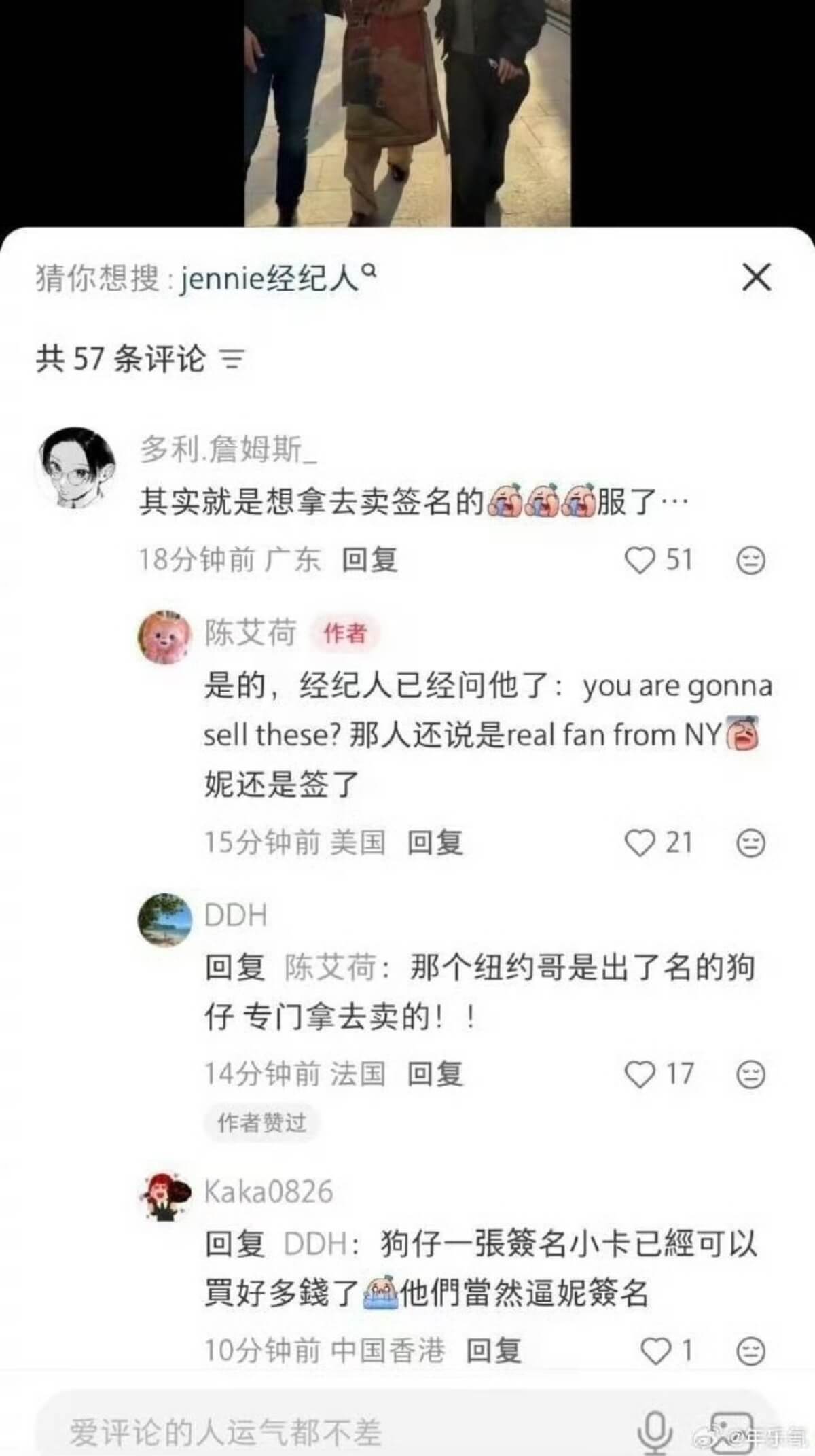 雖然但是,粉絲解釋這群人根本不是粉絲,而是所謂的黃牛,這天明明就是Jennie的私人行程,但他們緊緊跟隨,導致Jennie不得不停下來和他們協商:「能否給我一天自己的時間,你們這樣我真的壓力很大」,他們做出承諾後,Jennie隨即開始簽名👇