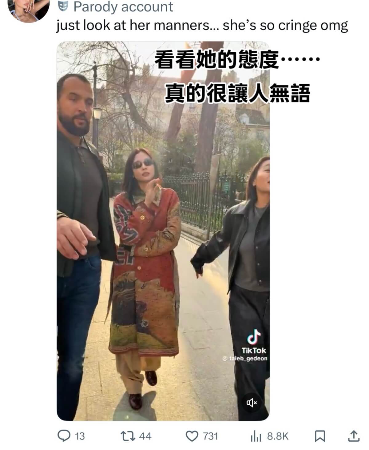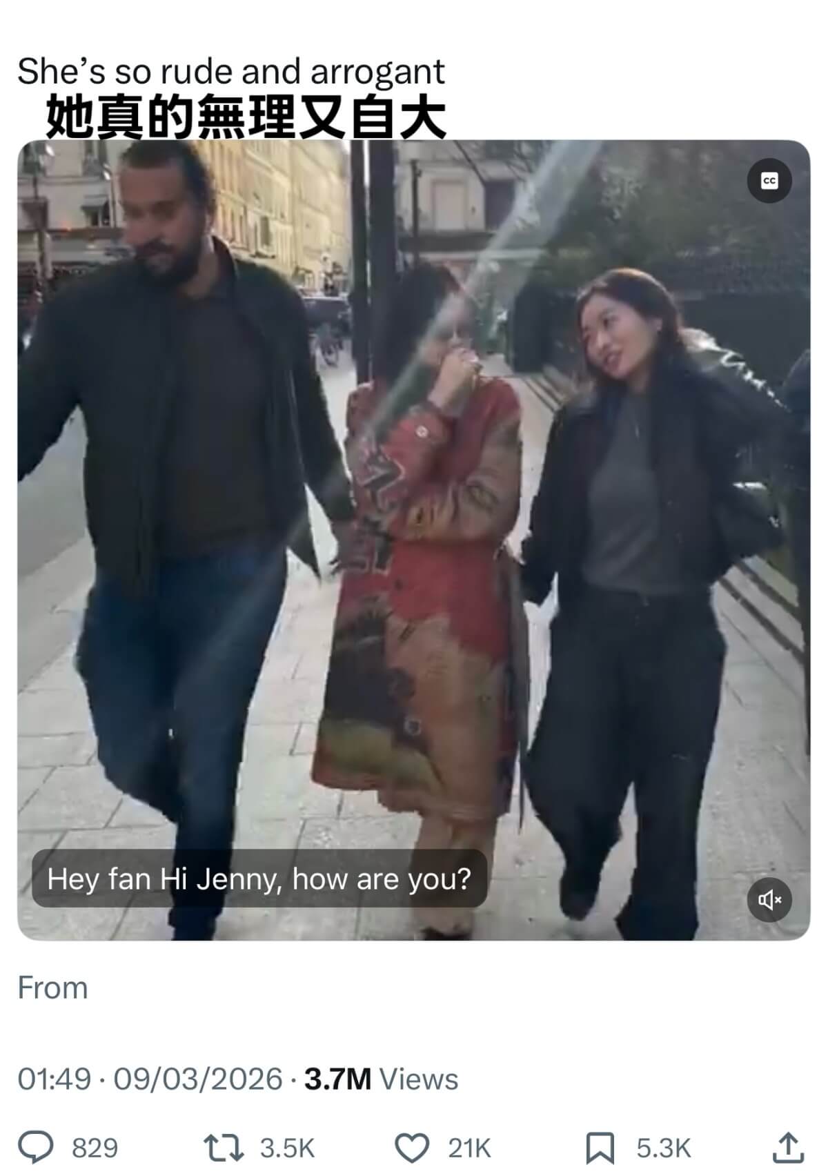 但沒想到抵達巴黎之後,一段Jennie在巴黎街頭和「粉絲」簽名的影片就被瘋傳,討論度最高的帖主,直接批評她傲慢又無理👇