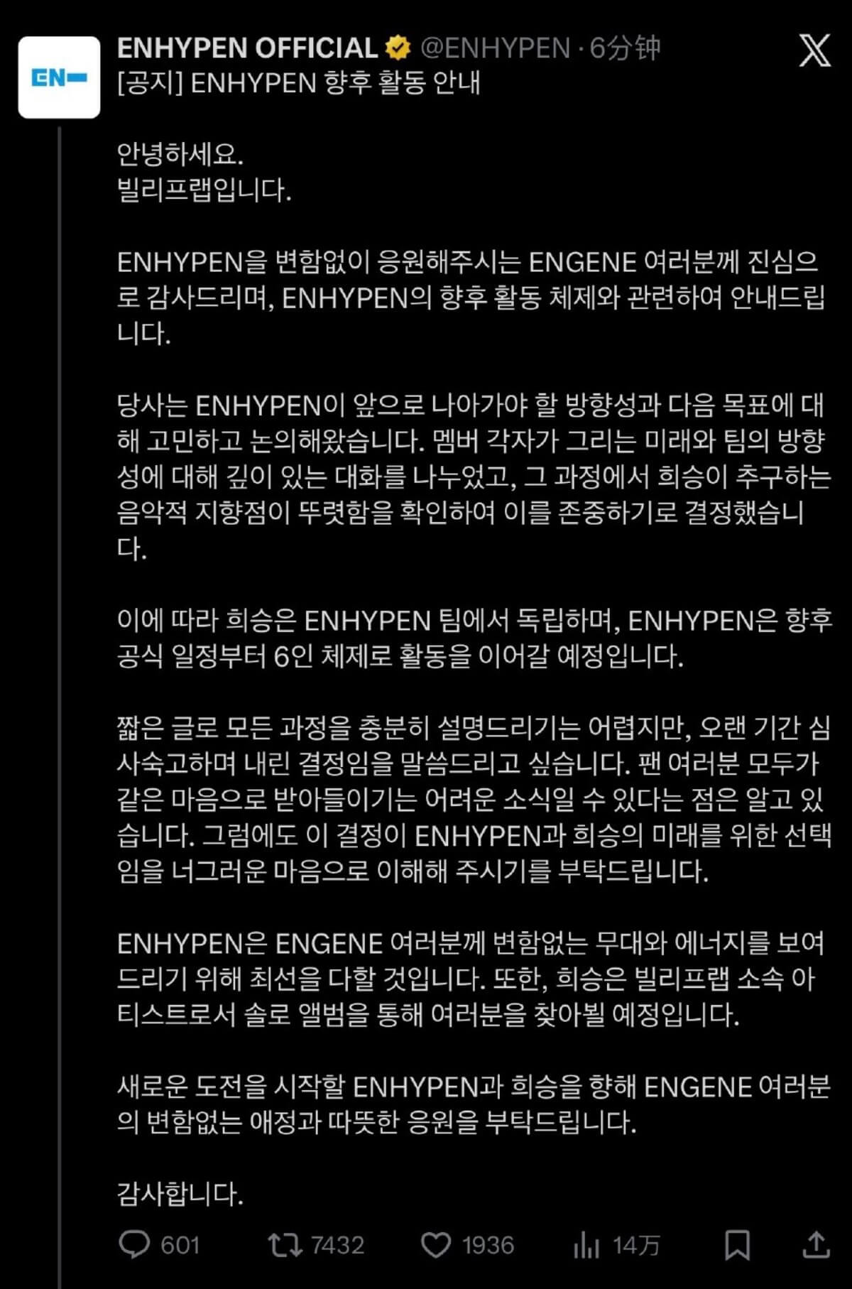 雖然用這簡短的文字,無法對整個過程予以充分說明,但希望大家能夠了解,這是經長時間的深思熟慮後做出的決定。我們知道這個消息對所有粉絲來說,可能很難以同樣的心情去接受。但這是為ENHYPEN和HEESEUNG的未來考量而做出的決定,希望大家予以理解。