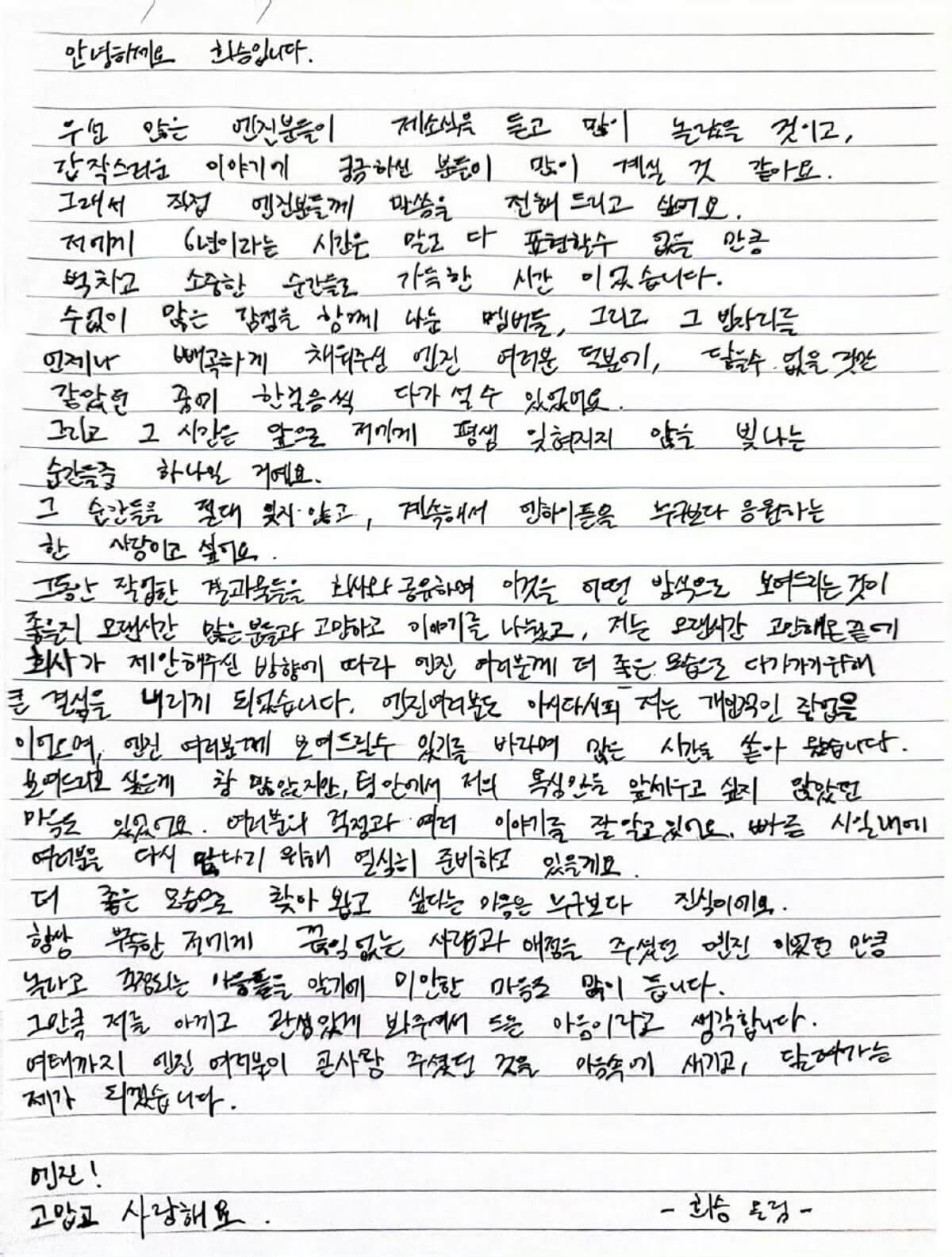 而李羲承隨後也公開了手寫信,解釋了退團的原因,並將以Solo繼續活動👇