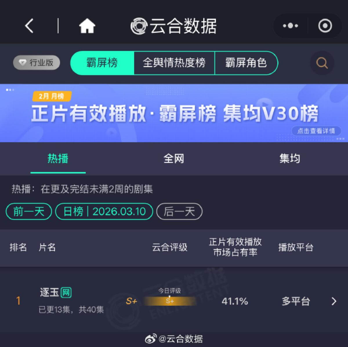 如果你對雙平台破萬沒什麼概念,那可以用雲合數據來輔助一下!《逐玉》在11號突破了市佔率40%!